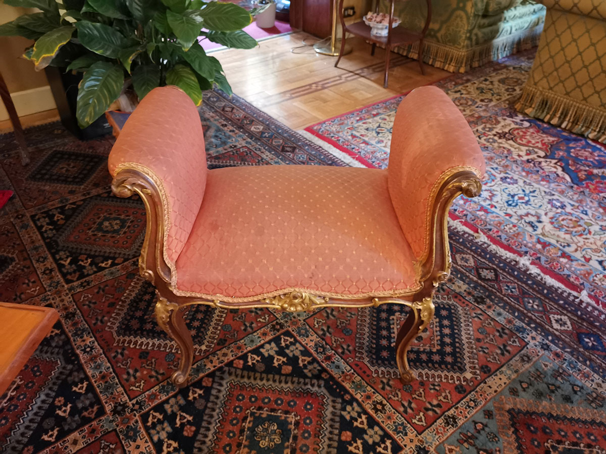 Piccola panchetta a due braccioli rivestita in stoffa rosa, stile Luigi XV.