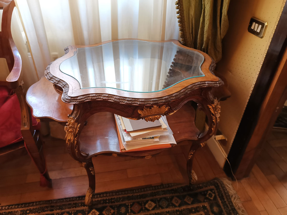 Tavolino di forma mossa, piano superiore in vetro, due ripiani laterali ad aletta, gambe mosse raccordate in basso da altro piano. Decorazioni dorate.