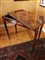 Tavolino da gioco piano intarsiato, piano apribile a libro, gambe dritte. Dimensioni: 94 x 90 cm.