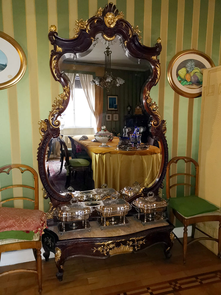 Specchiera in legno impiallacciato ed ornato di decorazioni intagliate e dorate, poggiante su base con ripiano in marmo e quattro piedi linea mossa, stile Luigi XV rivisitato. Dimensioni: 130 x 45 x 230 cm.