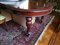Tavolo allungabile in mogano, meccanismo a manovella, quattro gambe a pilastro scanalato e gamba centrale a sostegno. Dimensioni chiuso: 140 x 120 cm. Sei prolunghe da 50 cm ciascuna, misure complessive: 440 x 120 cm.