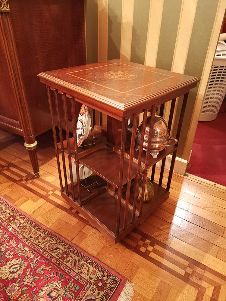 Libreria girevole impiallacciata in legni vari, stile inglese, sec. XX.