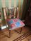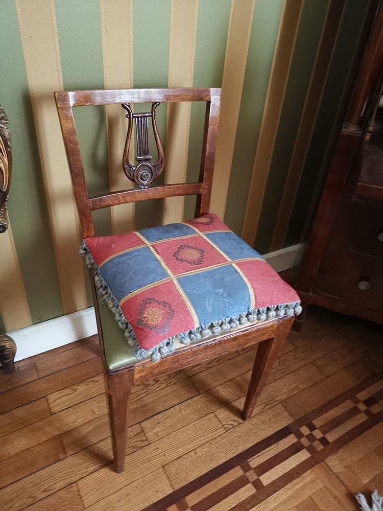 Coppia di sedie in noce, schienale rettangolare con cartella centrale a lira, piano ricoperto in stoffa.