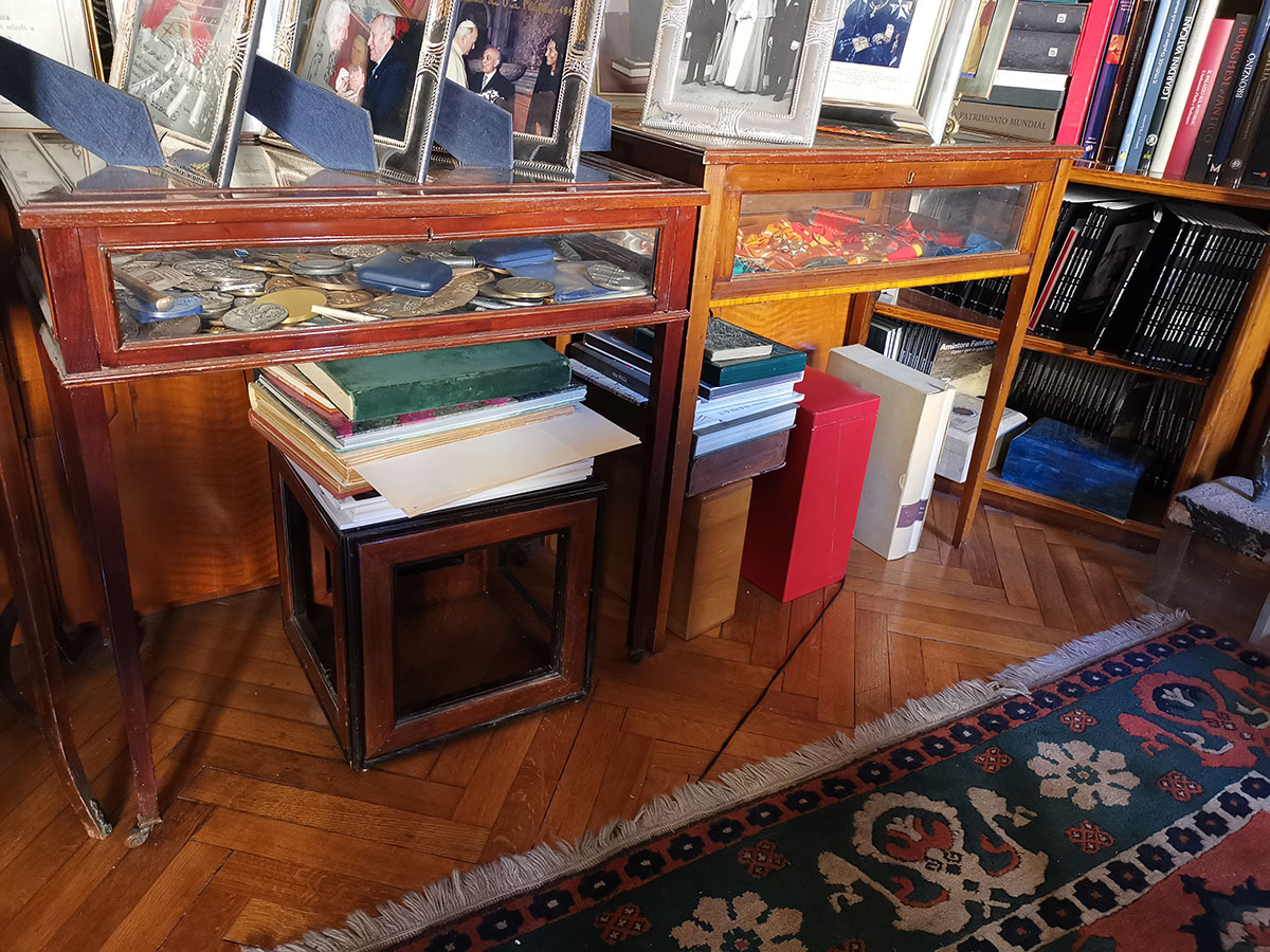 Cinque tavolini a vetrina di forma e dimensioni varie, contenenti medaglie ed onorificenze (il cui contenuto viene stimato in un'altra scheda).