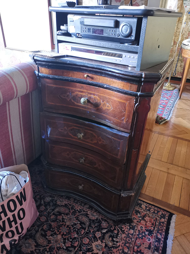 Inginocchiatoio linea mossa in noce filettato, un cassetto sotto il piano, tre cassetti, e base estraibile con vano, Roma sec. XVII. Dimensioni: 66 x 41 x 89 cm.