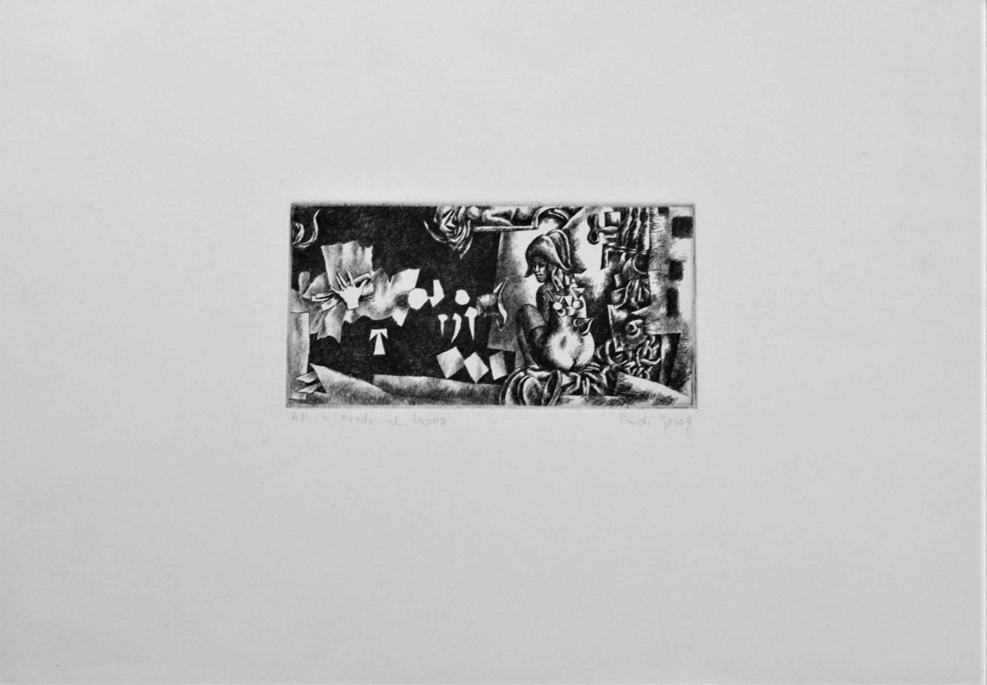 Rudi Gorog L'EREDE AL TRONO acquaforte, cm 10x20, su foglio cm 35x50 firma...