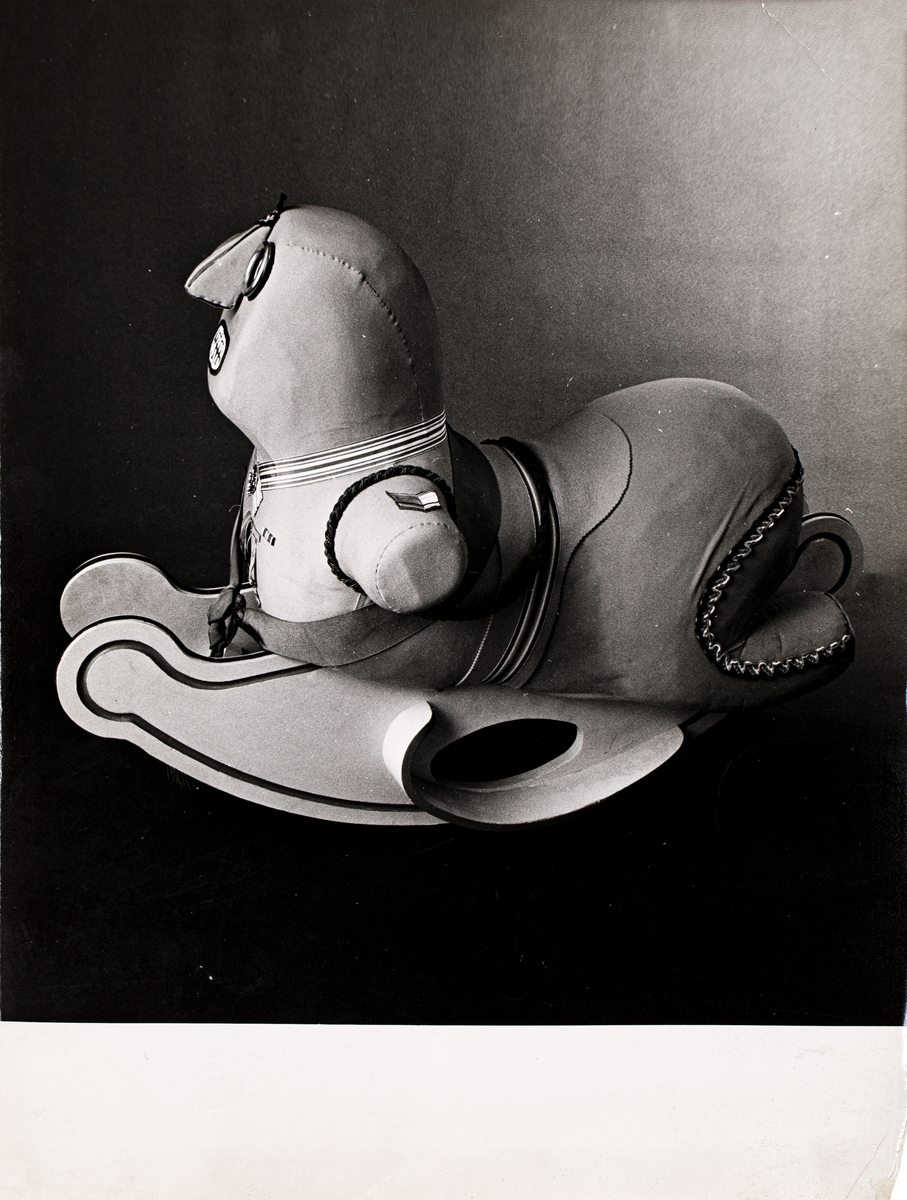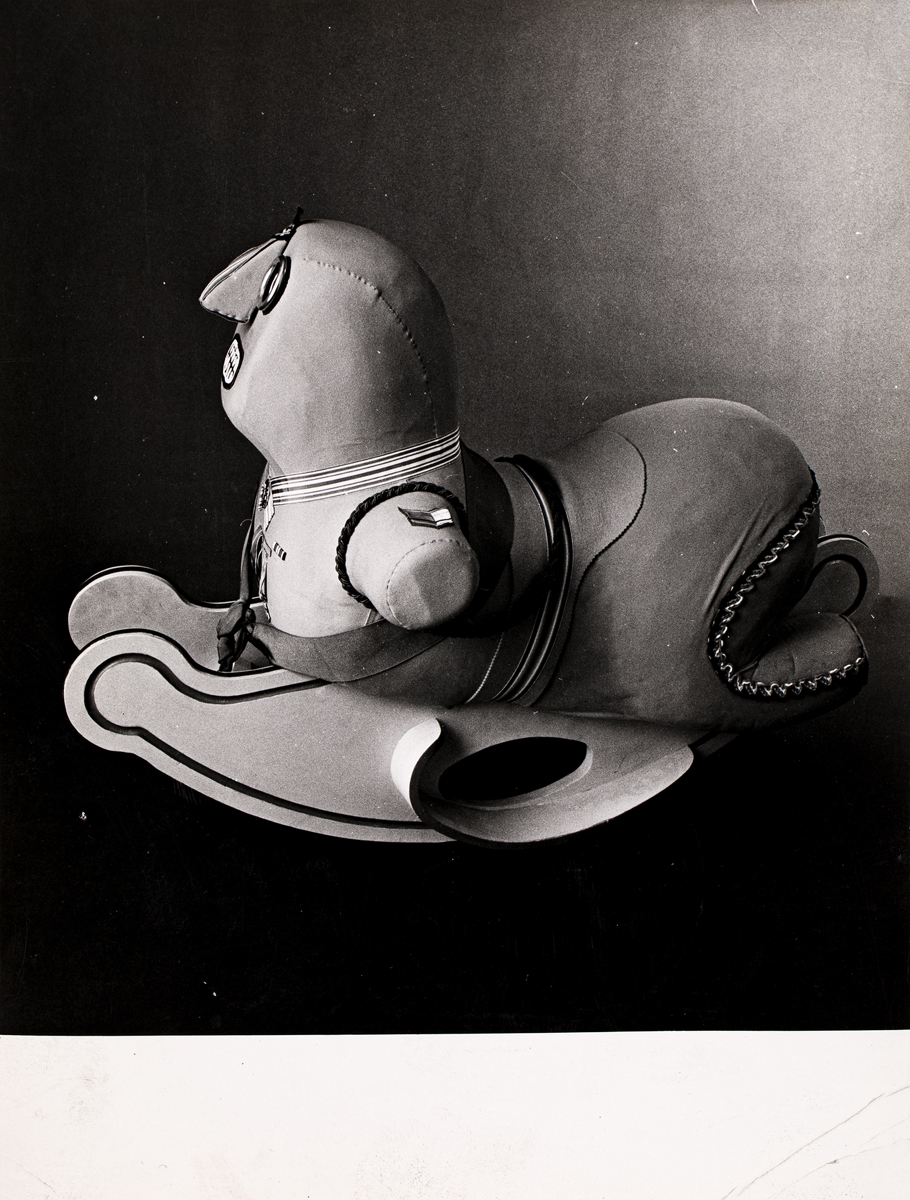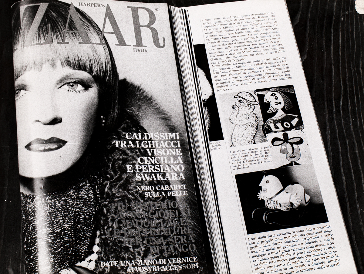 Si allegano una serie di fotografie della poltrona "il Generale a Dondolo" ed una fotografia della rivista Bazar in cui si parla della mostra dei multipli di Baj realizzati a mano organizzata dai Fratelli Bini con la poltrona