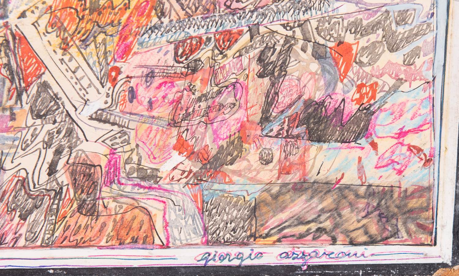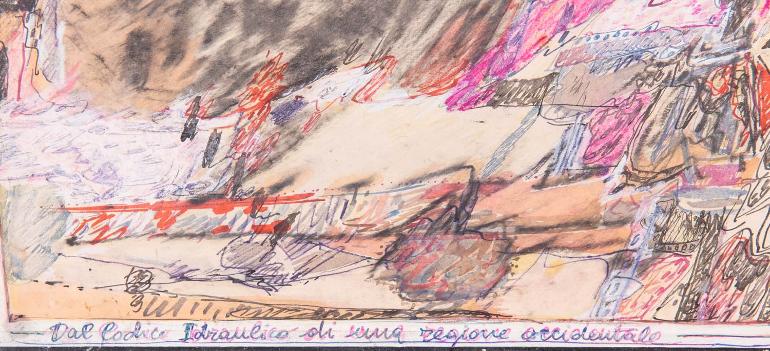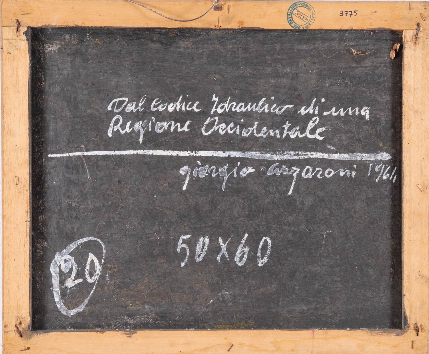 Giorgio Azzaroni (Bologna 1939 - 2009), “Dal Codice Idraulico di una Regione Occidentale”, 1964. Tecnica mista su carta applicata su tavoletta, firmato in basso a destra Giorgio Azzaroni, titolato in basso a sinistra ‘Dal Codice Idraulico di una Regione Occidentale’, al retro titolo, firma e data ‘Dal Codice Idraulico di una Regione Occidentale’ Giorgio Azzaroni 1964, H cm 50x60 Al retro reca timbro Galleria del Cavallino - Venezia con numero di inventario 3775.