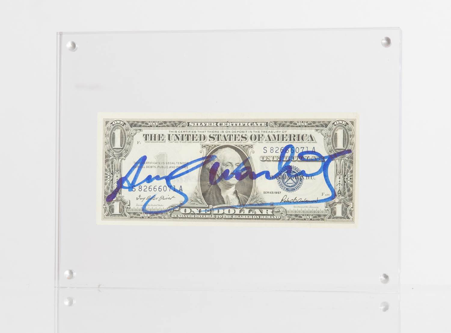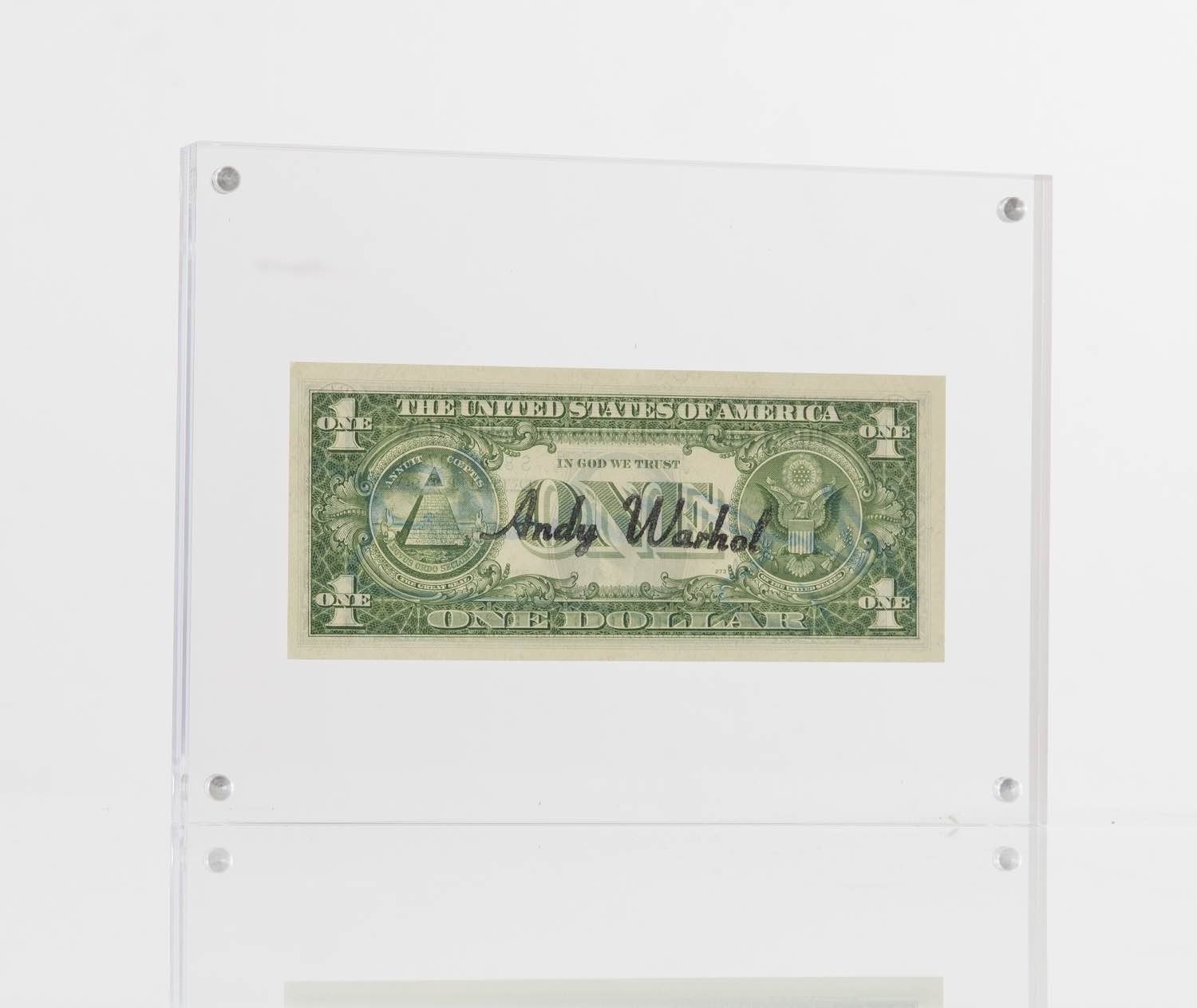 Andy Warhol (Pittsburgh 1928 - New York 1987), “1 dollar (George Washington)”, 1957 Pennarello su banconota, firma Andy Warhol sul davanti e timbro Andy Warhol sul retro, H cm 15.5x6.6 - entro plexiglas Opera accompagnata da certificato di autenticità Galierie 3/2 - Nice con numero S82666070A, timbro e firma.