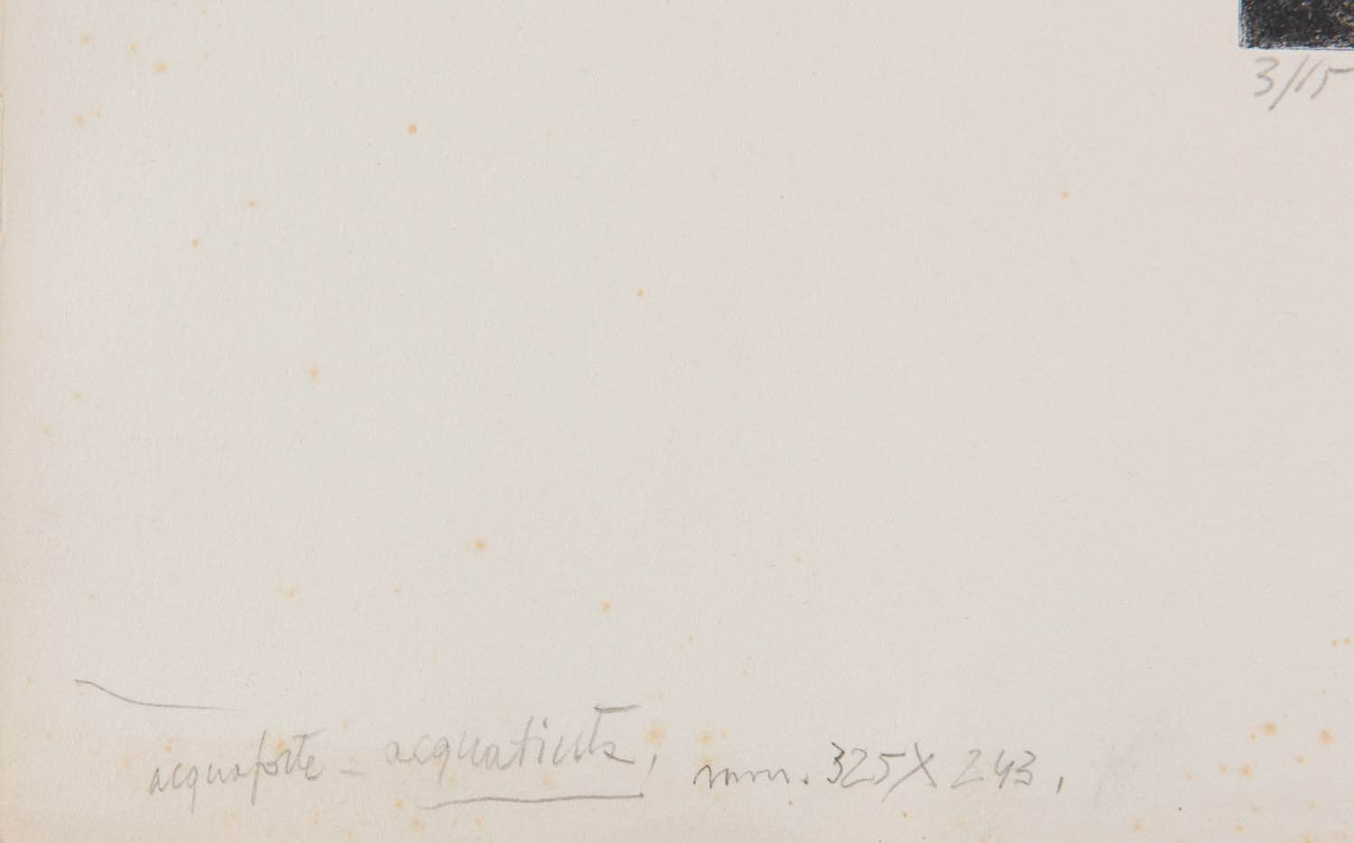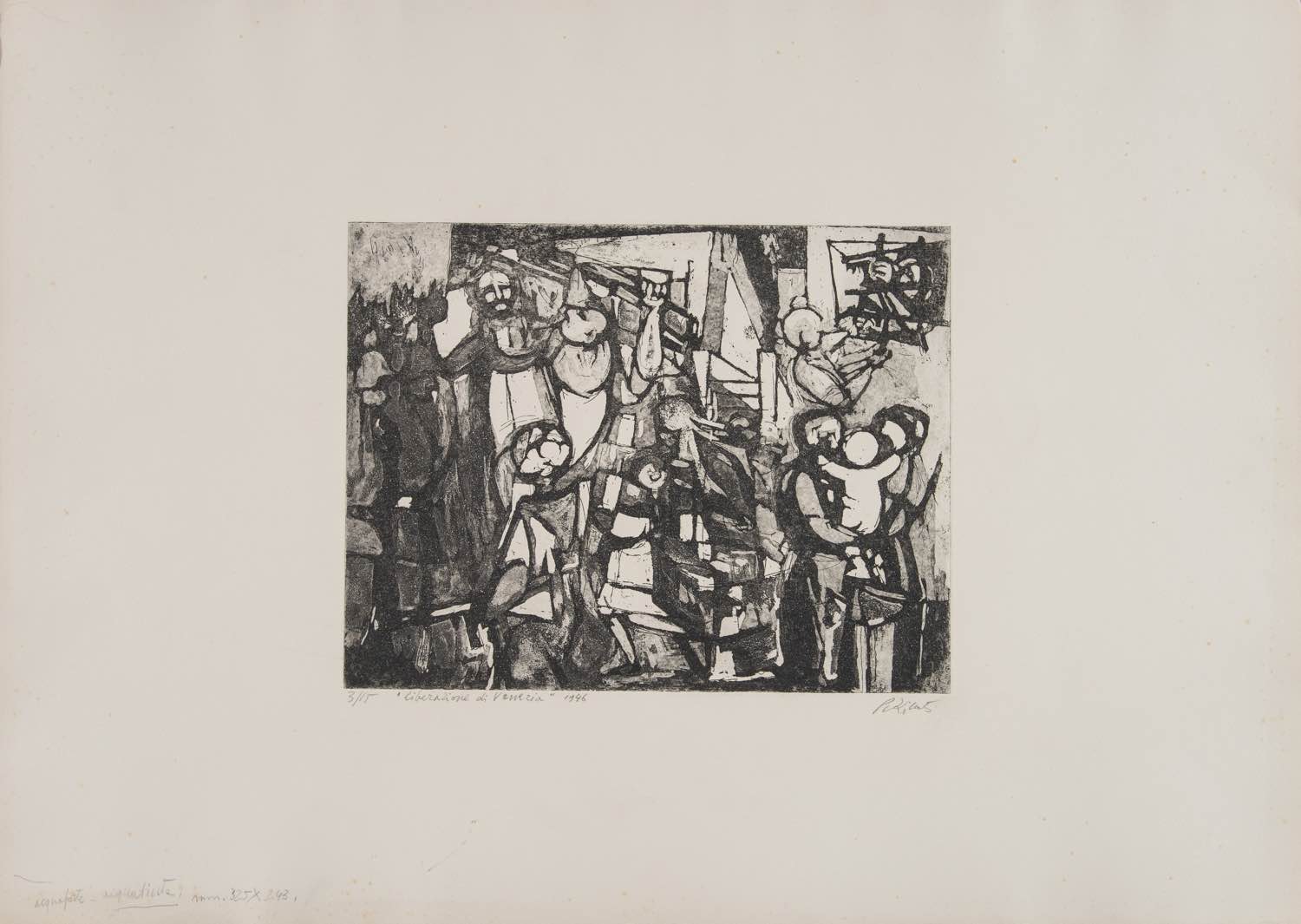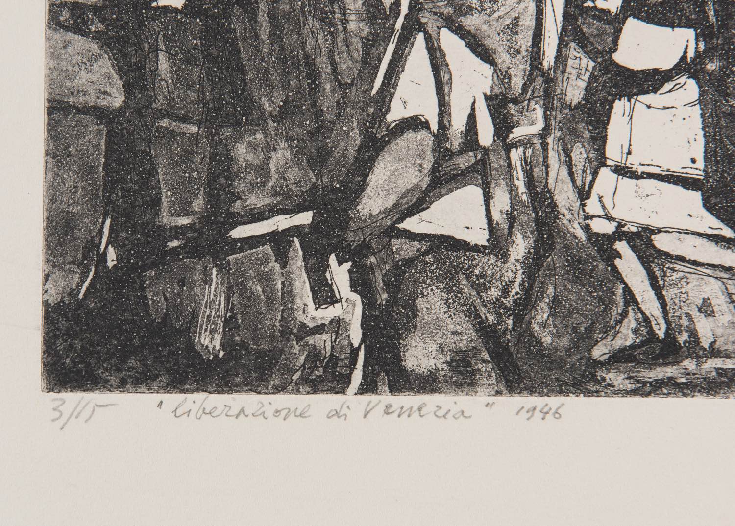 Armando Pizzinato (Maniago 1910 - Venezia 2004), “Liberazione di Venezia”, 1946. Acquaforte e acquatinta su carta, firmata in basso a destra Pizzinato, numero di tiratura, titolo e data in basso a sinistra 3/15 ‘Liberazione di Venezia’ 1946, Lastra H cm 25x32 - Foglio H cm 70x50