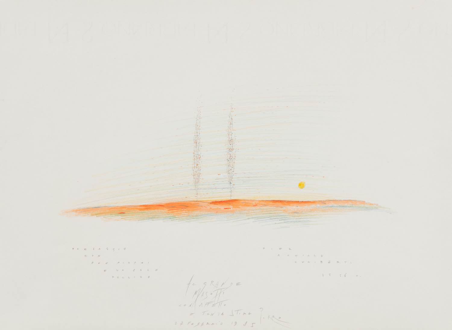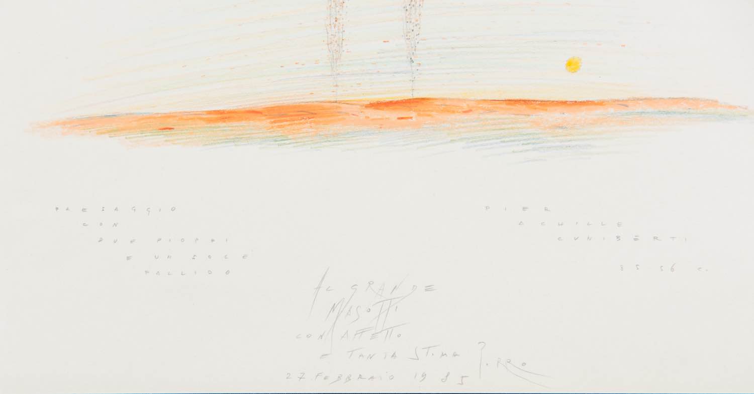 Pier Achille Cuniberti, detto Pirro (Sala Bolognese 1923 - Bologna 2016), “Paesaggio con due Pastello su carta, titolo in basso a sinistra ‘Paesaggio con due pioppi e un sole pallido’, dedica in basso al centro, firma e data in basso a destra Pier Achille Cuniberti 85 5 6 c., H cm 24x33