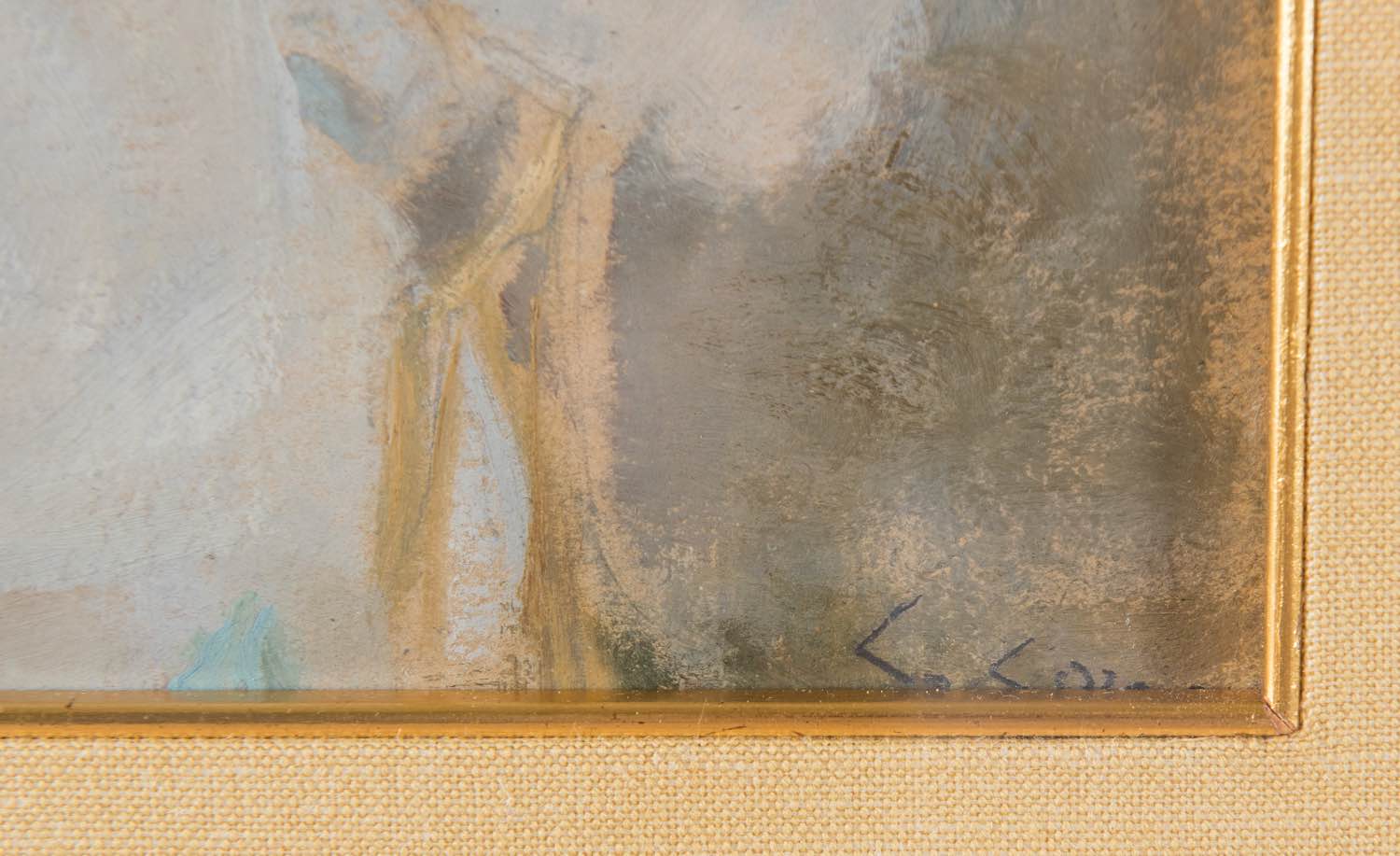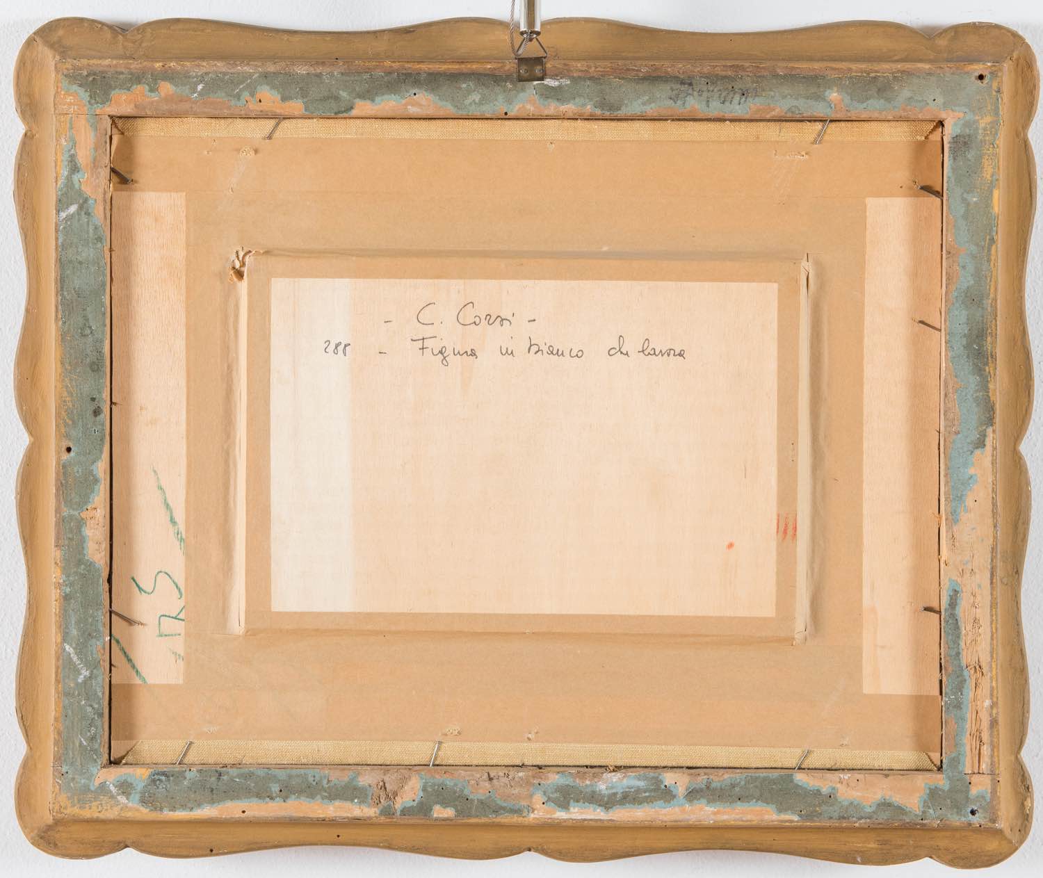 Carlo Corsi (Nizza 1879 - Bologna 1966), “Figura in bianco che lavora”. Tempera su tavoletta, firmata in basso a destra, iscrizione al retro ‘C. Corsi - 288 - Figura in bianco che lavora’, H cm 20x30 Opera accompagnata da certificato di autenticità su fotografia a firma della sorella Elisa Corsi.