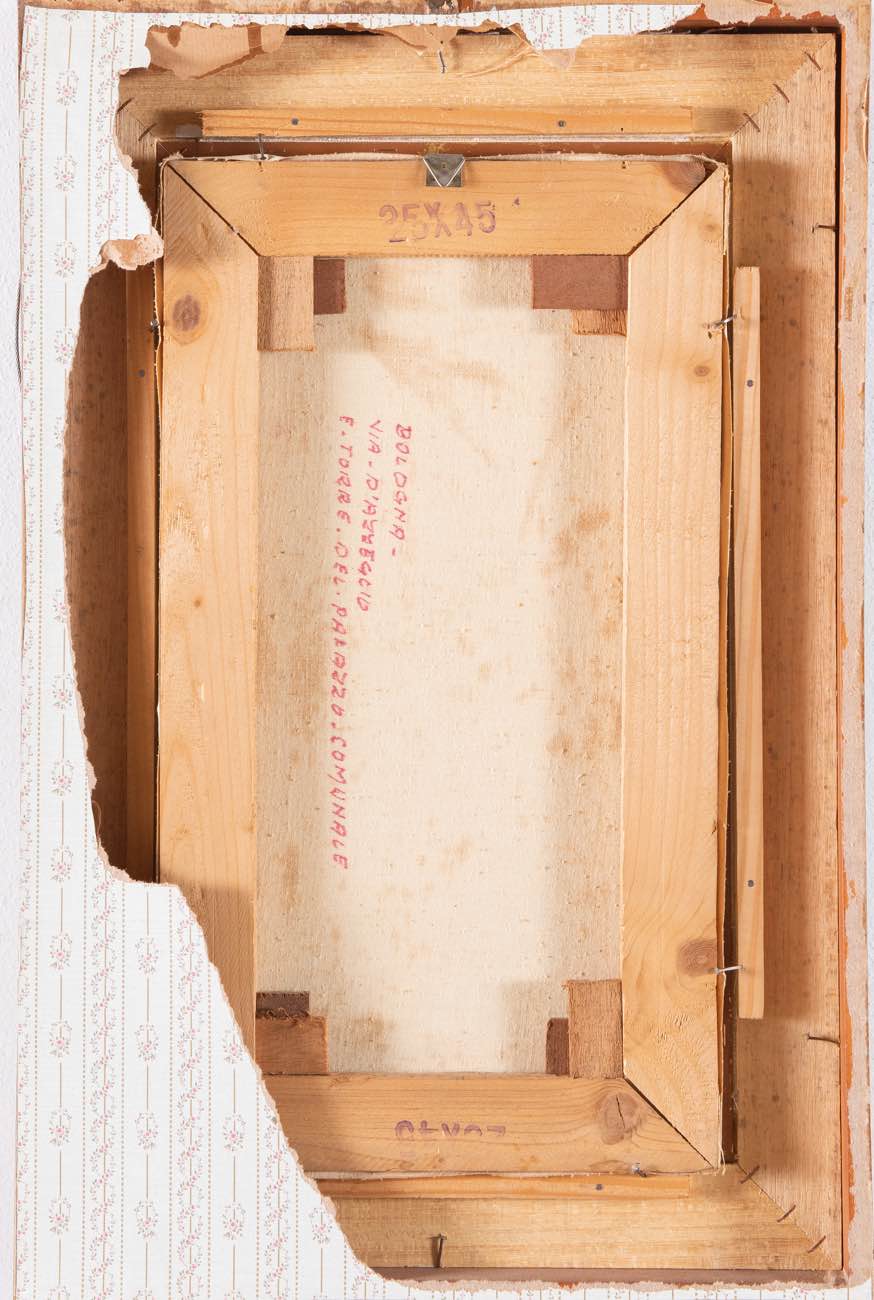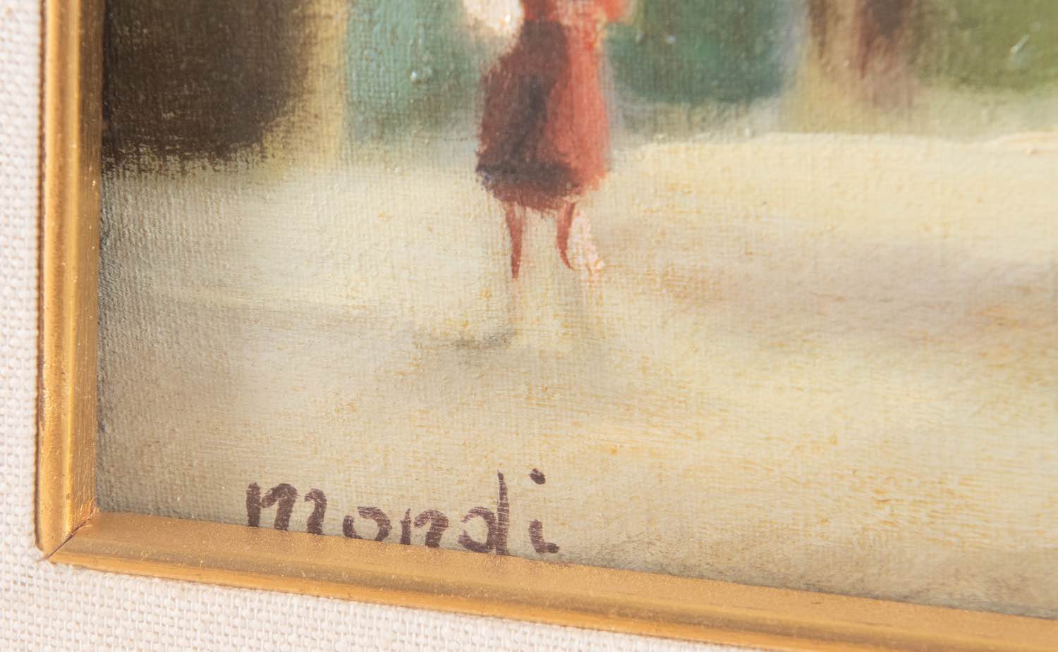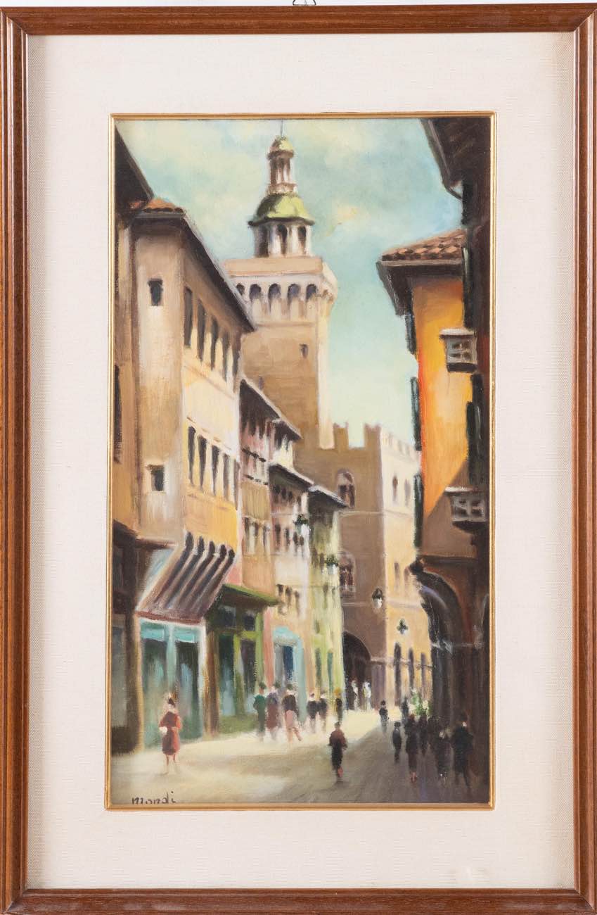 Pittore del XX secolo, “Bologna - Via D’Azeglio e Torre del Palazzo Comunale”. Tecnica mista su tela, firmato Mondi, H cm 45x25
