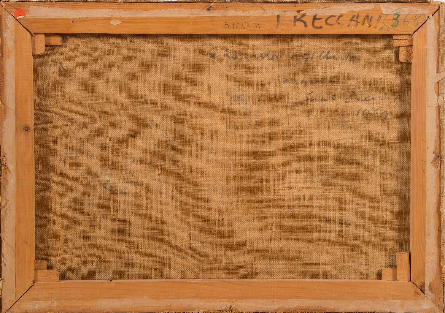 Ernesto Treccani (Milano 1920 - 2009), “Uccelli”, 1969. Olio su tela, dedica, firma e data al retro Ernesto Treccani 1969, iscrizioni e numeri sul telaio, H cm 50x70
