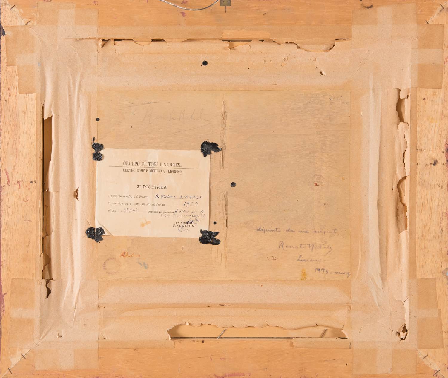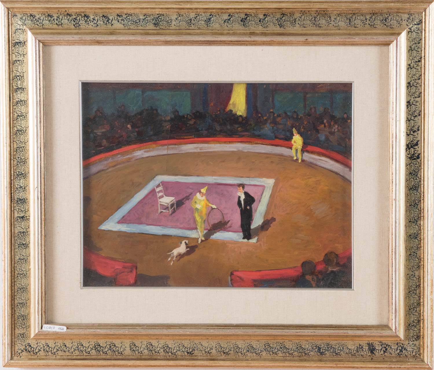 Renato Natali, “Il circo” (Livorno 1883 -1979), 1970. Olio su tavola, firmato in basso a destra R. Natali, H cm 33x43 Al retro iscrizione autografa ‘dipinto da me … Renato Natali Livorno 1973 - marzo’. Al retro reca etichetta Gruppo Pittori Livornesi - Centro d’Arte Moderna Modena - Livorno e timbri Studio d’arte.