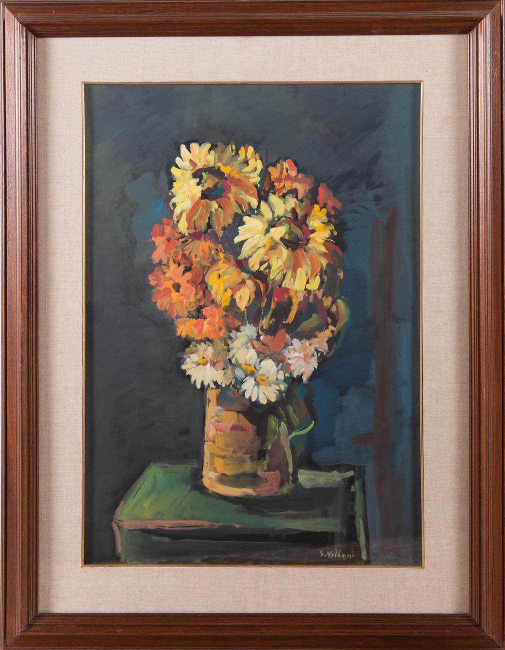 Sergio Vellani (Carpi 1918) , “Vaso con fiori”. Olio su cartone, firmato in basso a destra S. Vellani, H cm 66x46
