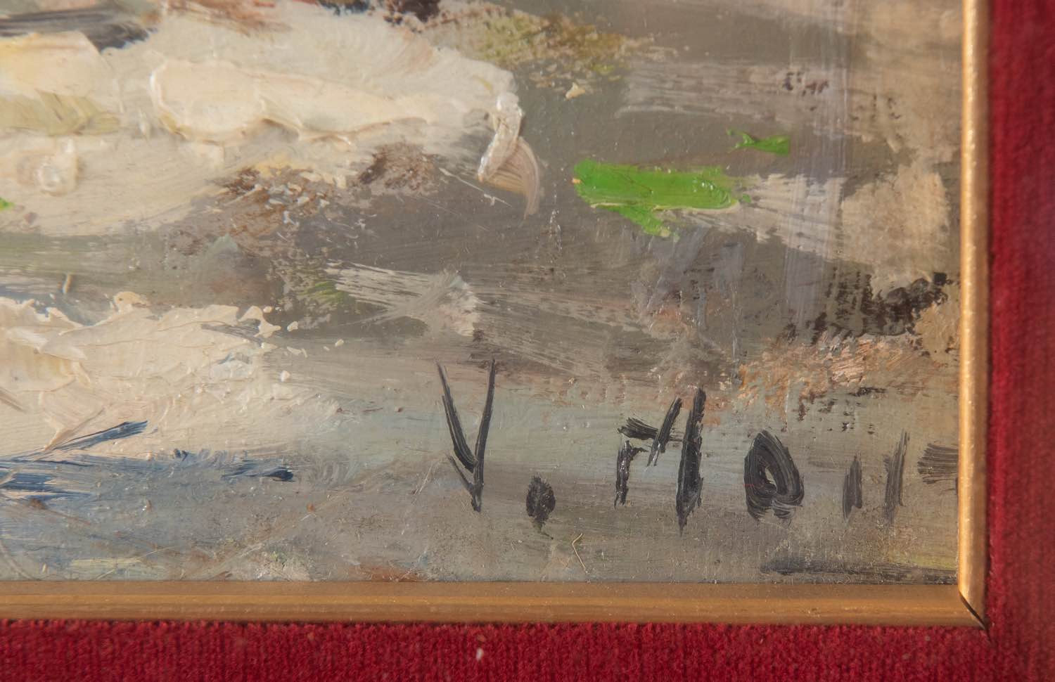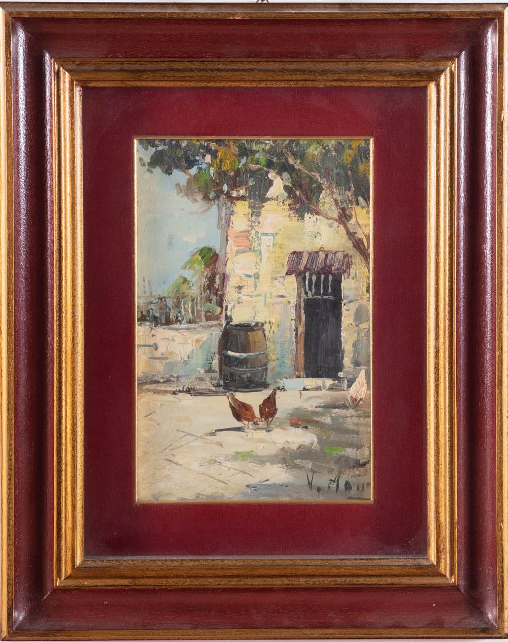 Pittore del XX secolo, “Nell’aia”. Olio su tavoletta, firmato in basso a destra V. Molla, H cm 30x20
