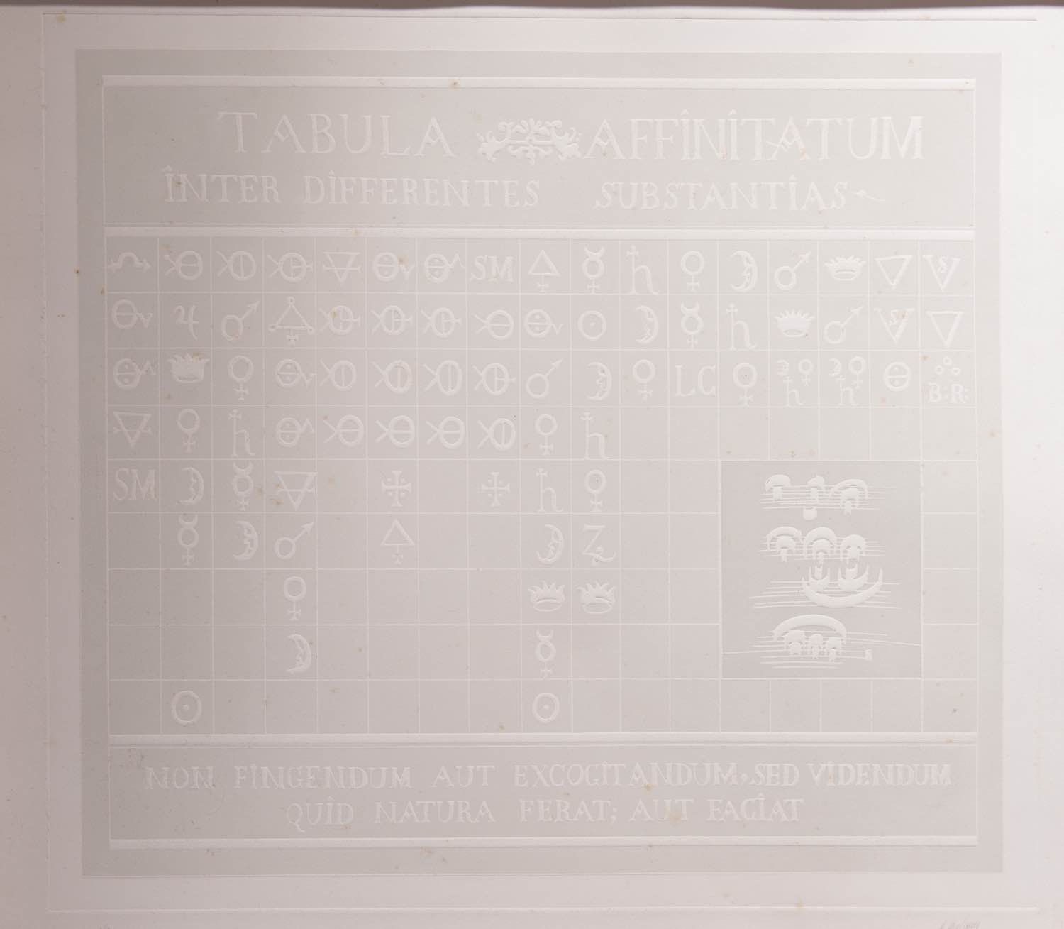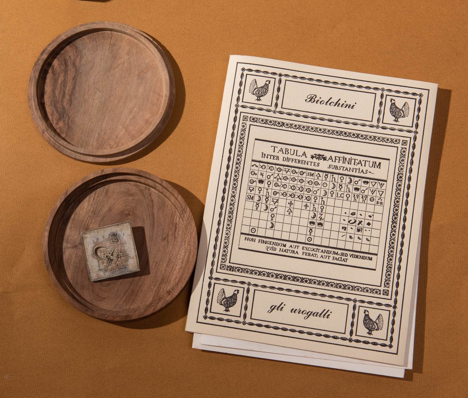 Raffaele Biolchini (Pavullo nel Frignano 1946), “Tabula Affinitatum”, 1979. Litografia entro cofanetto originale, esmplare 1/30, H cm 50x60, accompagnata da volume di presentazione di Maria Luisa Righini Bonelli della collana “gli urogalli” e unito ad una spilla in argento firmata Biolchini (entro custodia originale)