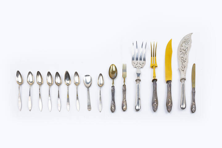- Set di posate rivestite in argento composto da forchettone, coltello, forchettina, coltello piccolo e cucchiaio, entro scatola peso lordo 273.4