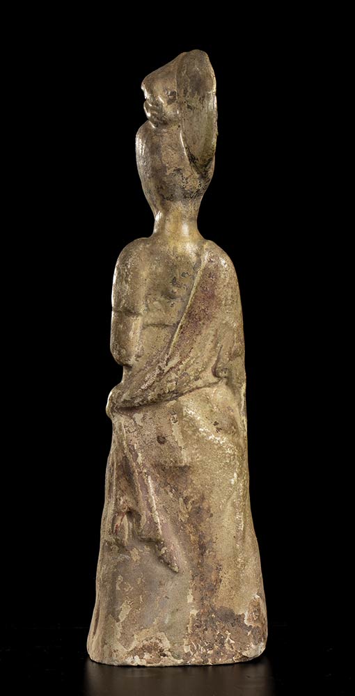 La figura stante, vestita di ampio abito sorretto sul davanti dal braccio sinistro piegato al petto, quello destro disteso lungo il fianco, la superficie esterna rivestita di invetriatura color crema.