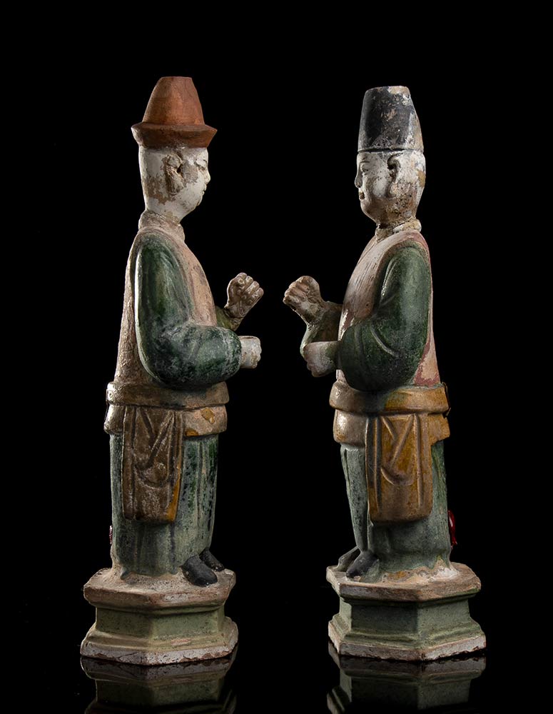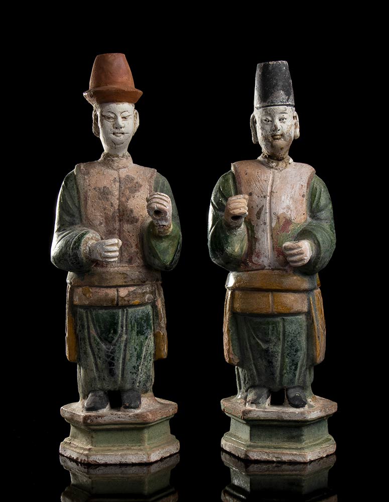 DUE FIGURE DI DIGNITARI IN TERRACOTTA DIPINTA<br>Cina, stile della dinastia Ming