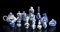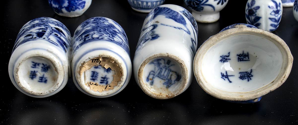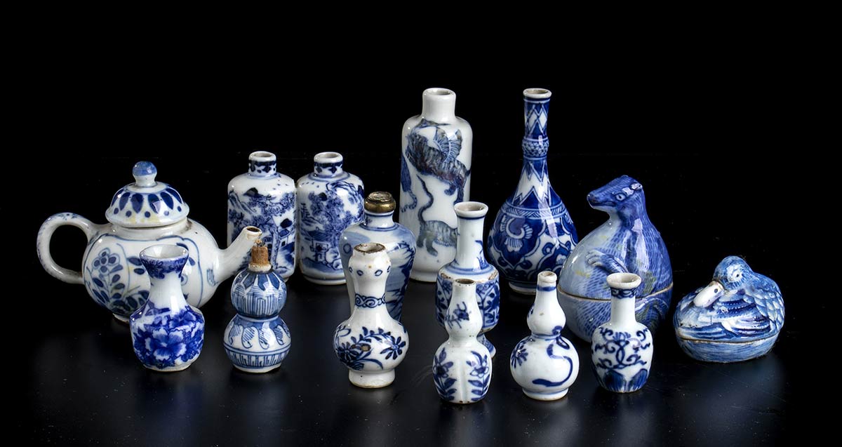 GRUPPO DI QUATTORDICI CONTENITORI IN PORCELLANA 'BIANCO E BLU' IN MINIATURA<br>Cina, periodo Kangxi e dopo