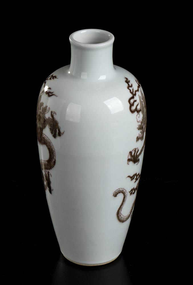 VASO A BALAUSTRO IN PORCELLANA CON DECORO DI DRAGHI IN ROSSO DI RAME<br>Cina, XX secolo