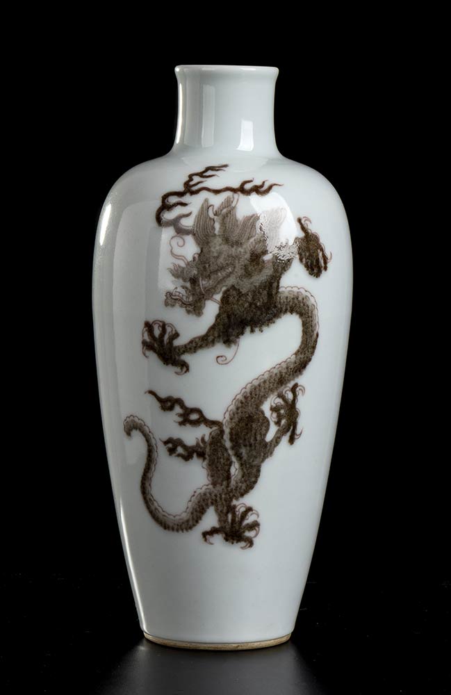 VASO A BALAUSTRO IN PORCELLANA CON DECORO DI DRAGHI IN ROSSO DI RAME