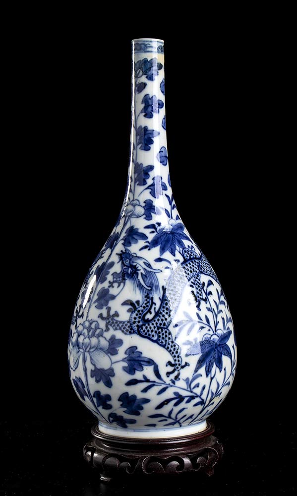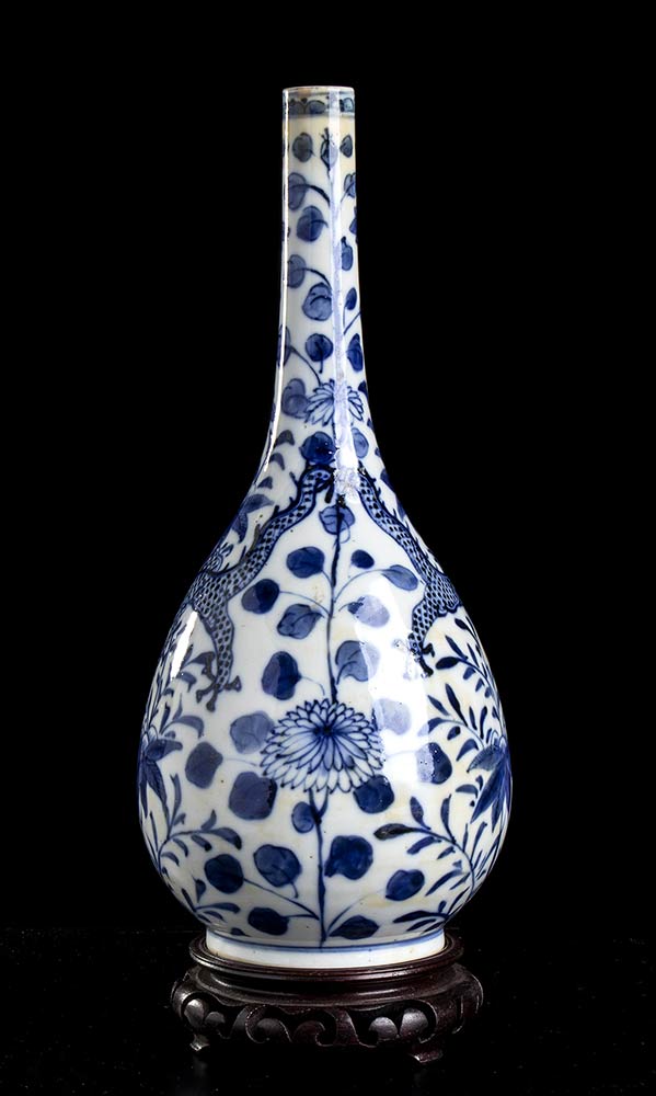 VASO A BOTTIGLIA IN PORCELLANA 'BIANCO E BLU' CON DECORO DI DRAGHI<br>Cina, XIX-XX secolo