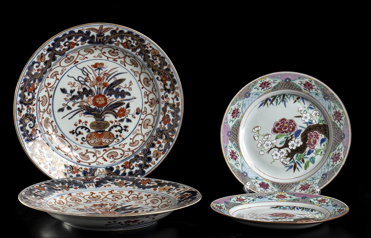 Due cinesi con decorazione a smalti della Famiglia Rosa, metà del XVIII secolo; due giapponese con decorazione di tipo Imari, XVIII secolo.