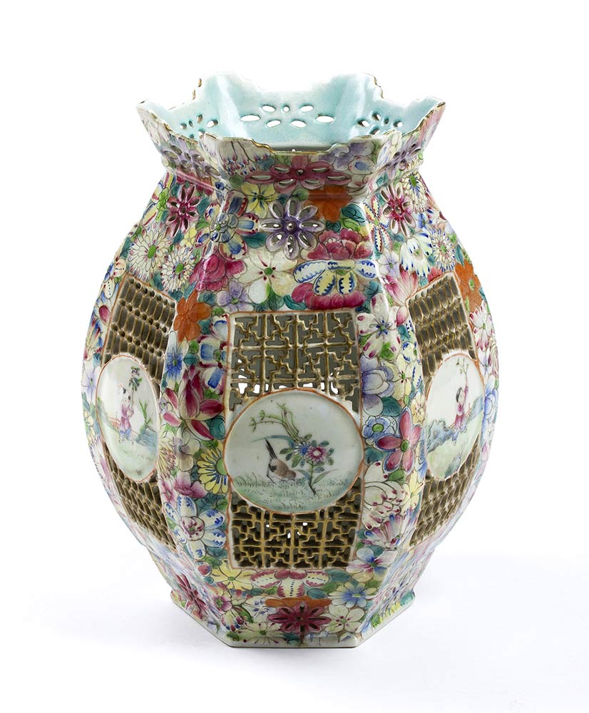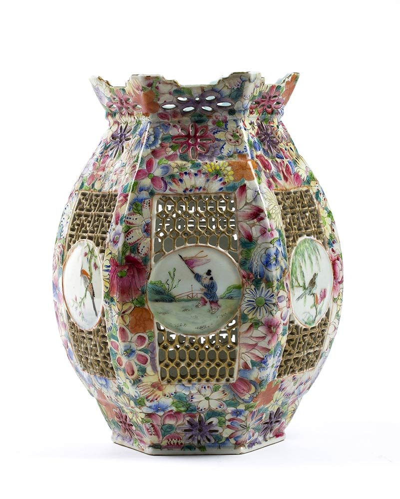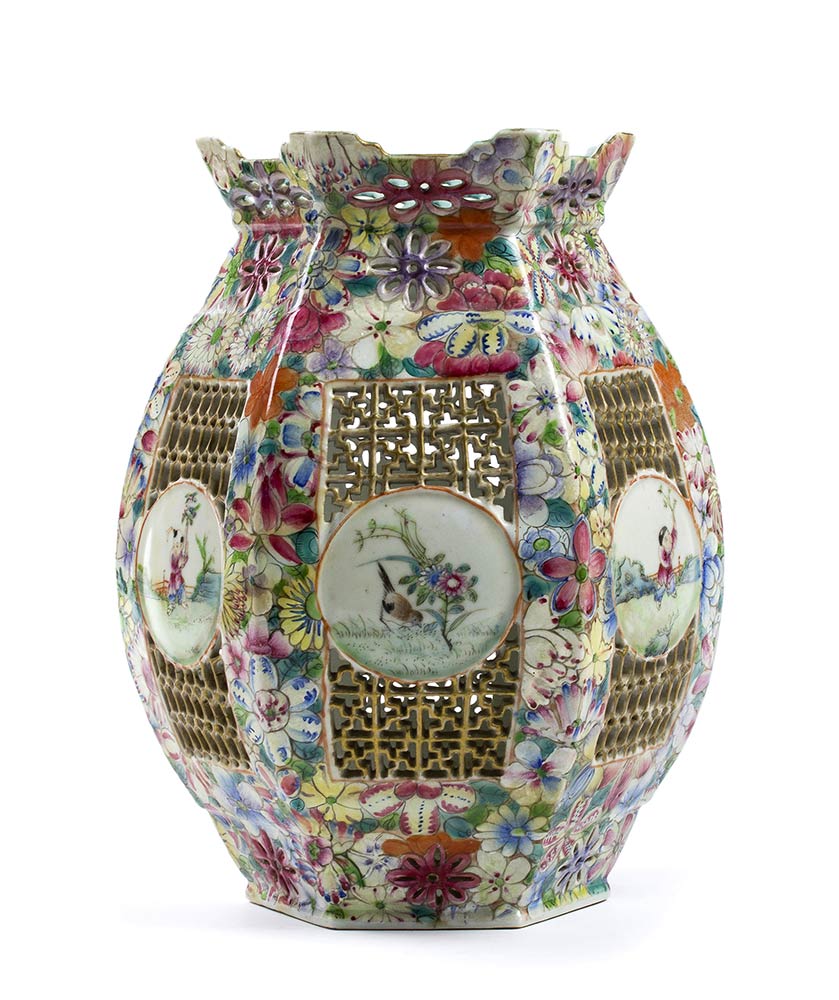 Lanterne simili erano realizzate a Jingdezhen già durante il regno dell’imperatore Yongzheng (vedi S. Pierson, Chinese Ceramics, Londra 2009, p. 37, fig. 46, per un esemplare della metà della dinastia Qing nel Victoria & Albert Museum di Londra).