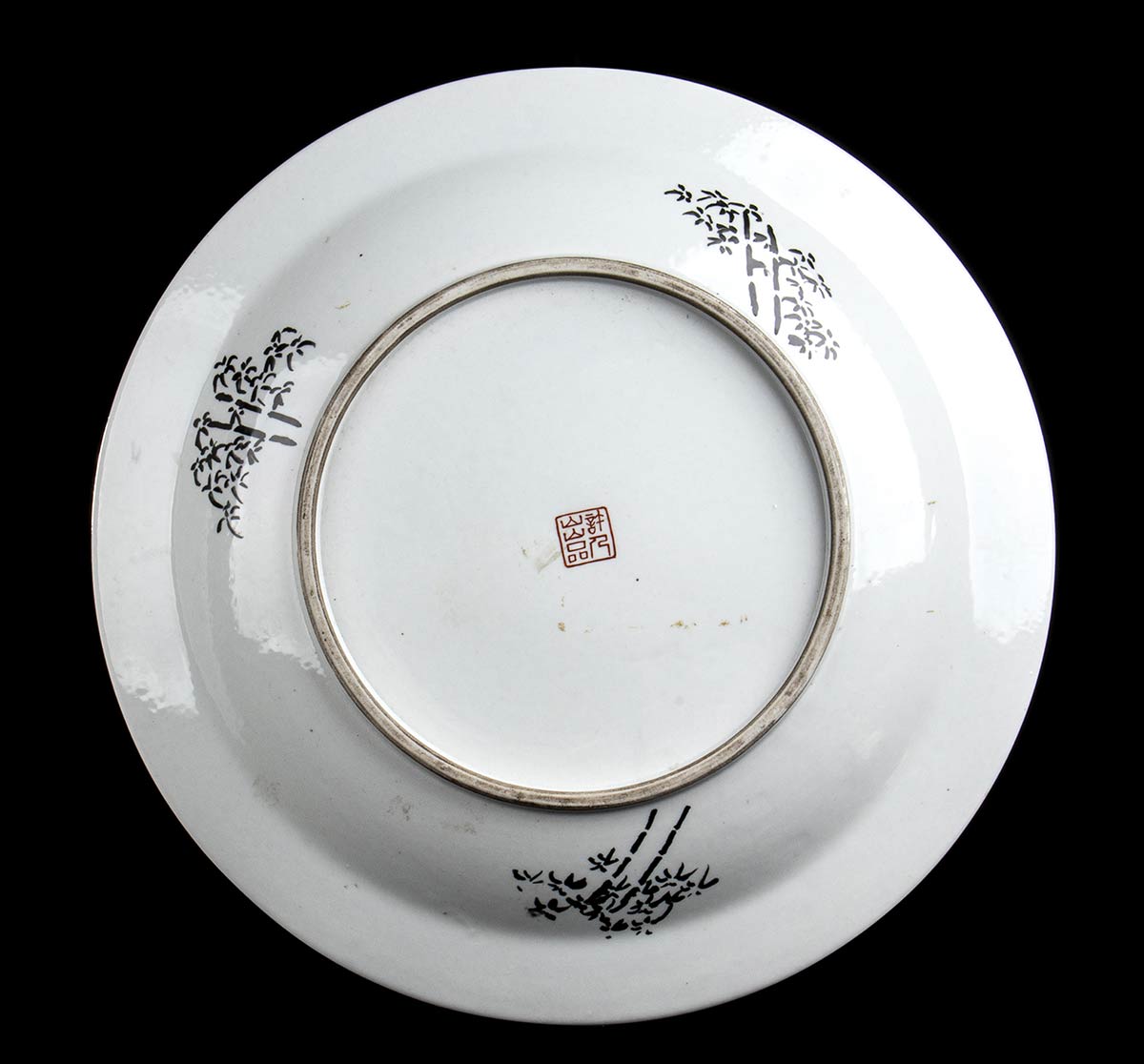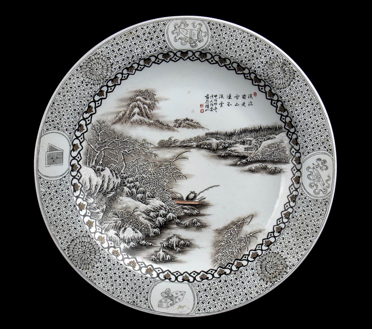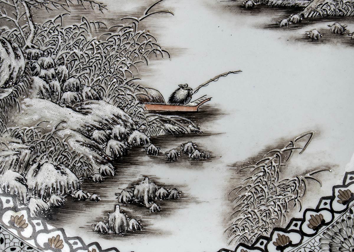 GRANDE PIATTO IN PORCELLANA CON DECORO 'EN GRISAILLE'<br>Cina, XX secolo