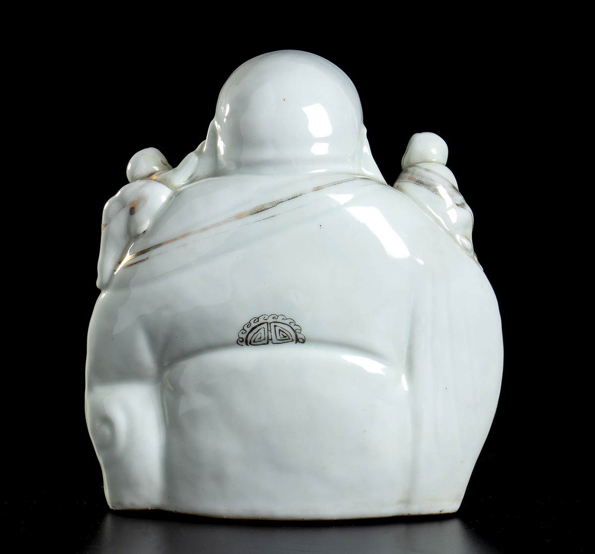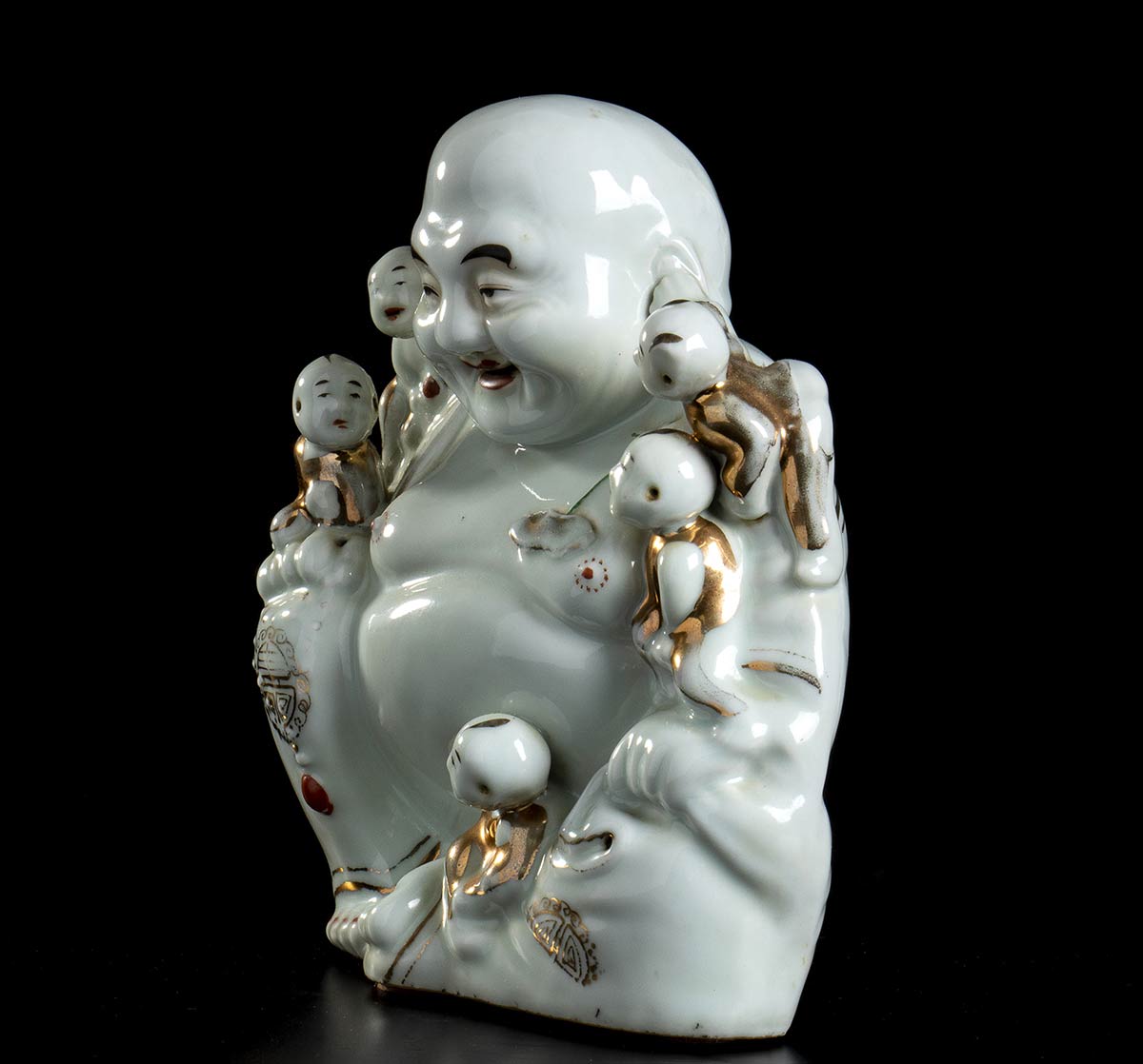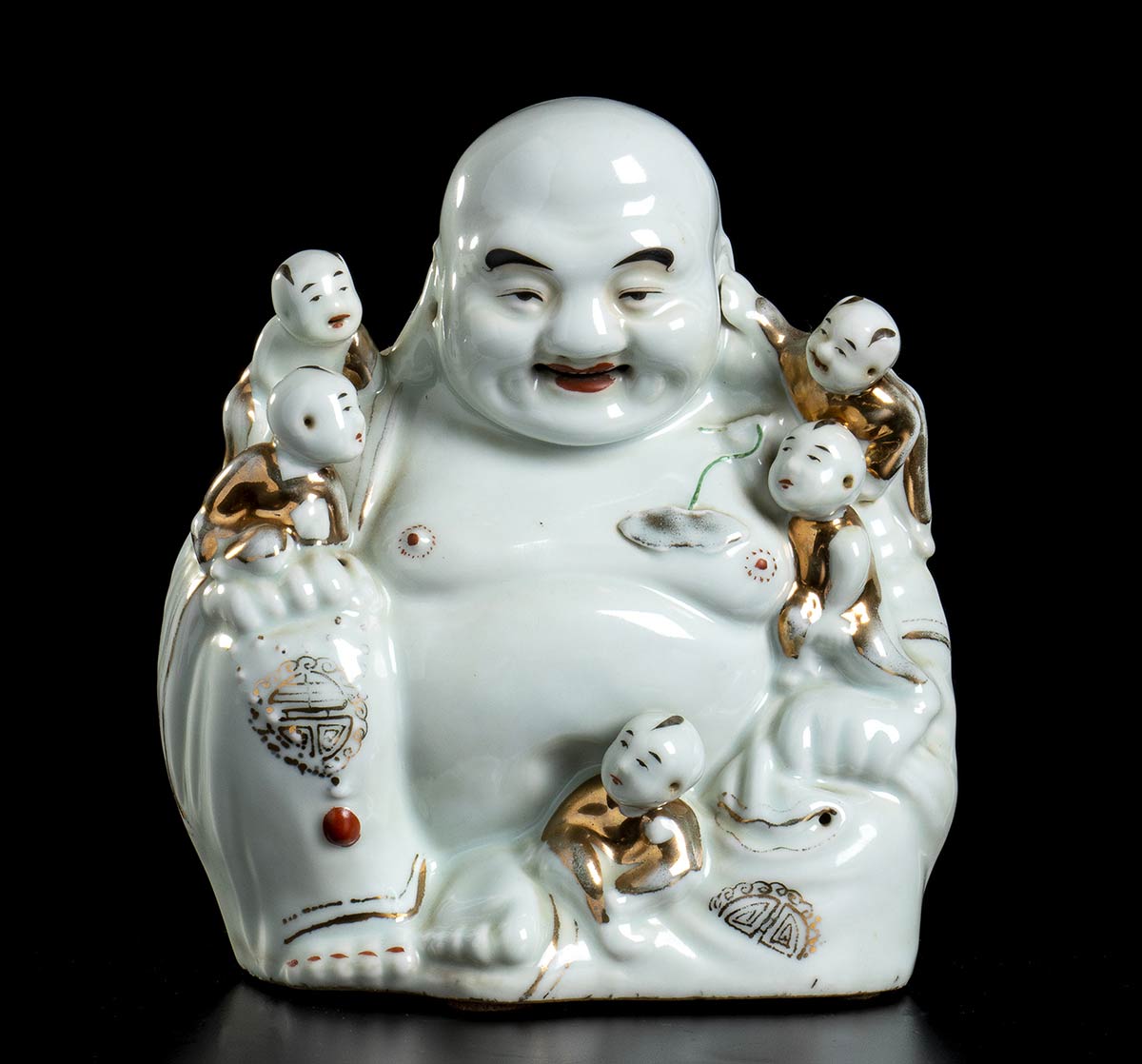 Lotto 54 | BUDAI CON BAMBINI IN PORCELLANA PARZIALMENTE DORATA<br>Cina, XX secolo