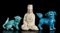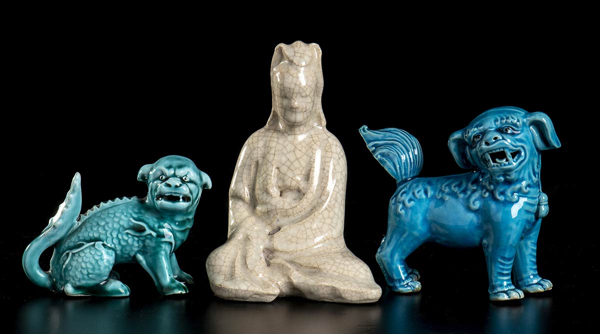 Il lotto si compone di una scultura raffigurante Guanyin con invetriatura bianca percorsa da fitta craquelure e di due sculture raffiguranti animali mitologici a invetriatura turchese.