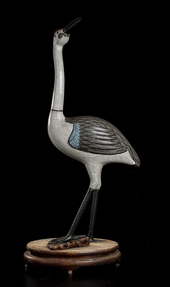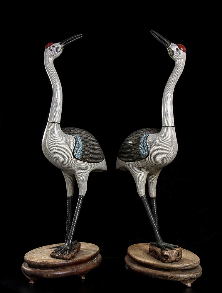 COPPIA DI GRU IN METALLO SMALTATO A CLOISONNÉ<br>Cina, inizio del XX secolo