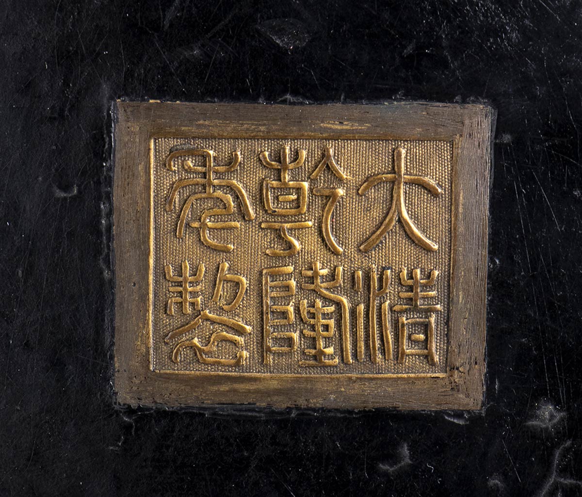 Il lato superiore del coperchio decorato con una scena di figure nel paesaggio con rocce, vegetazione e architetture, sui lati un ricco ornato floreale, marchio apocrifo di Qianlong al centro della base.
