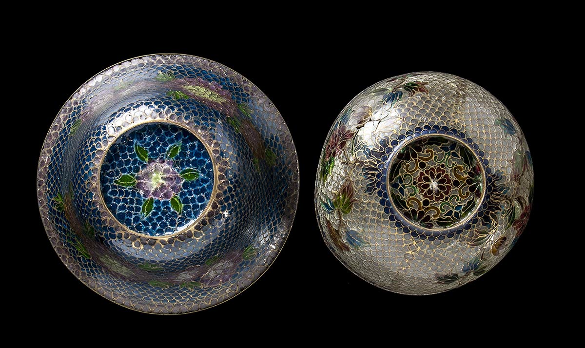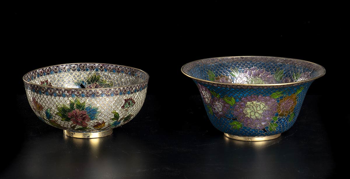 DUE CIOTOLE IN VETRO CLOISONNÉ<br>Cina, XX secolo