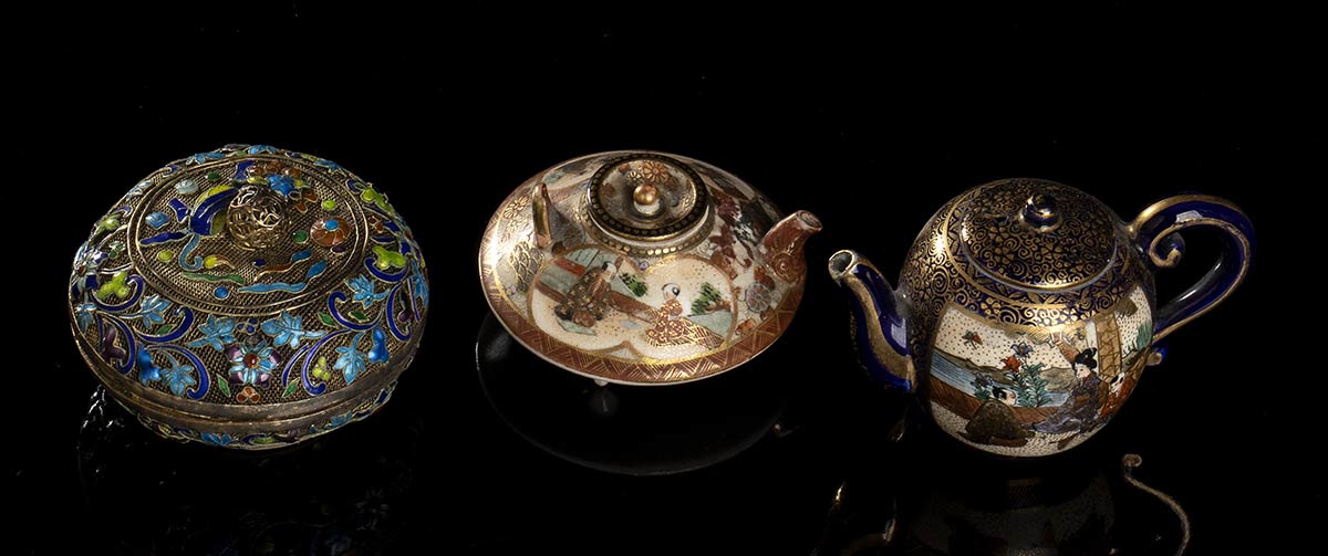 DUE PICCOLE TEIERE IN CERAMICA 'SATSUMA' E UNA SCATOLA CON COPERCHIO IN ARGENTO SMALTATO<br>Cina e Giappone, inizio del XX secolo