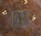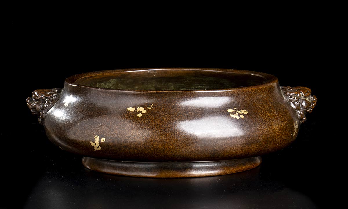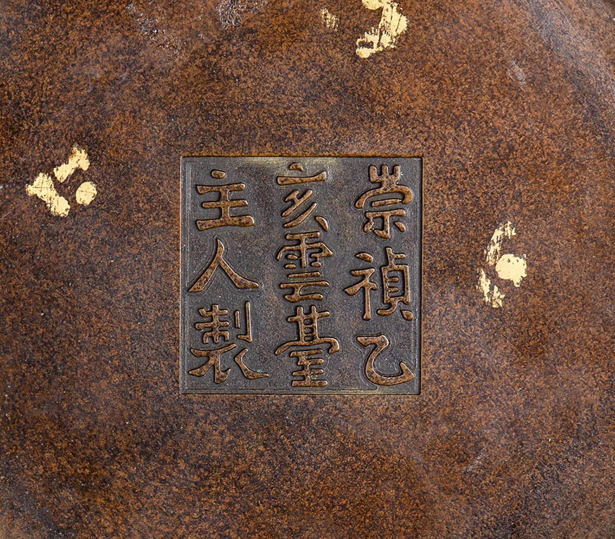 A sezione circolare, presenta due prese a forma di leone, sulla superficie esterna diffuse macchie dorate, marchio 崇禎乙亥雲基主人製 (Chongzhen yihai yunji zhuren) al centro della base.