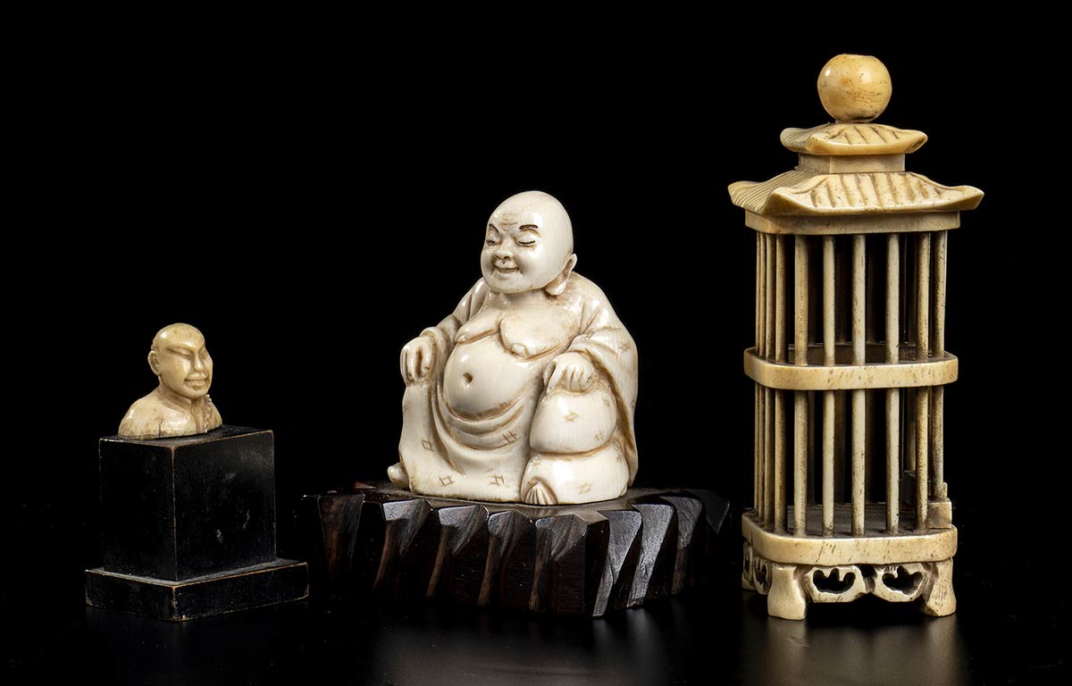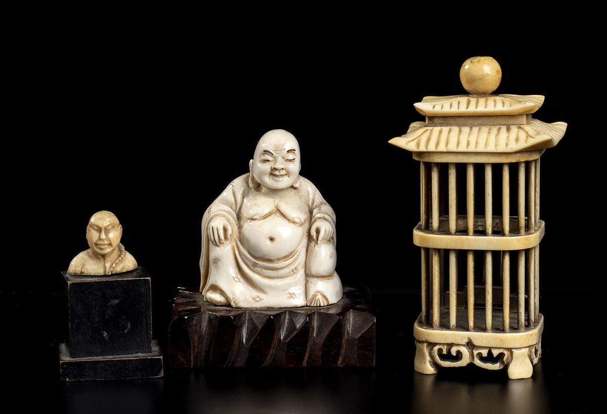 Il lotto si compone di una scultura in avorio di Budai con sua base in legno, di un piccolo busto di uomo in avorio e di una gabbietta in corno con lato anteriore apribile.