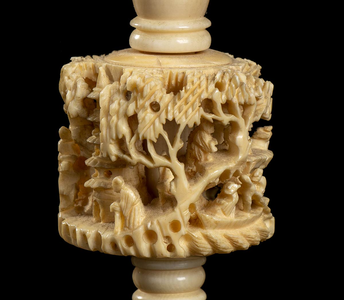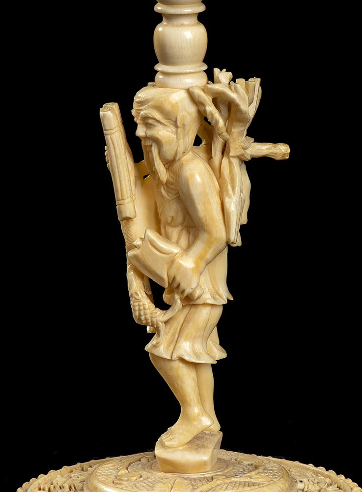 Base circolare ornata di drago, sulla quale si erge una figura maschile stante, a sua volta sormontata da cilindro finemente decorato con paesaggio con figure su cui si posa fusto modanato con uccello a tutto tondo.