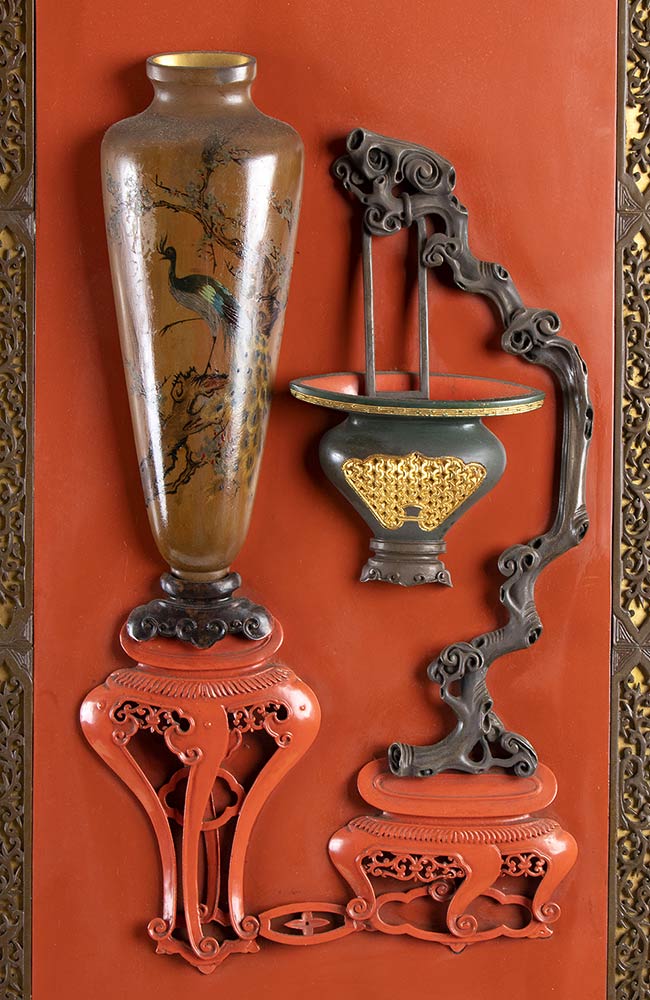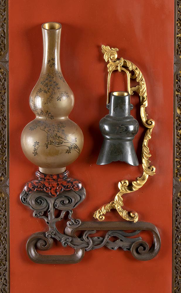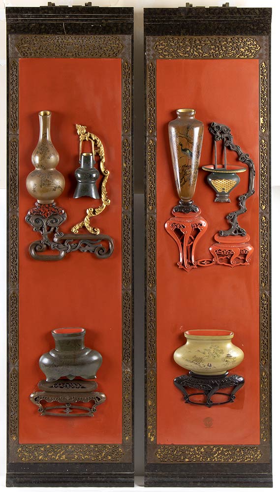 Di forma rettangolare, presentano entrambi sulla superficie a vista una composizione profusamente dipinta di vasi di varie forme in accentuato rilievo, ognuno su propria base che simula veri sostegni in legno, due dei contenitori sospesi a tronco di forma naturalistica.