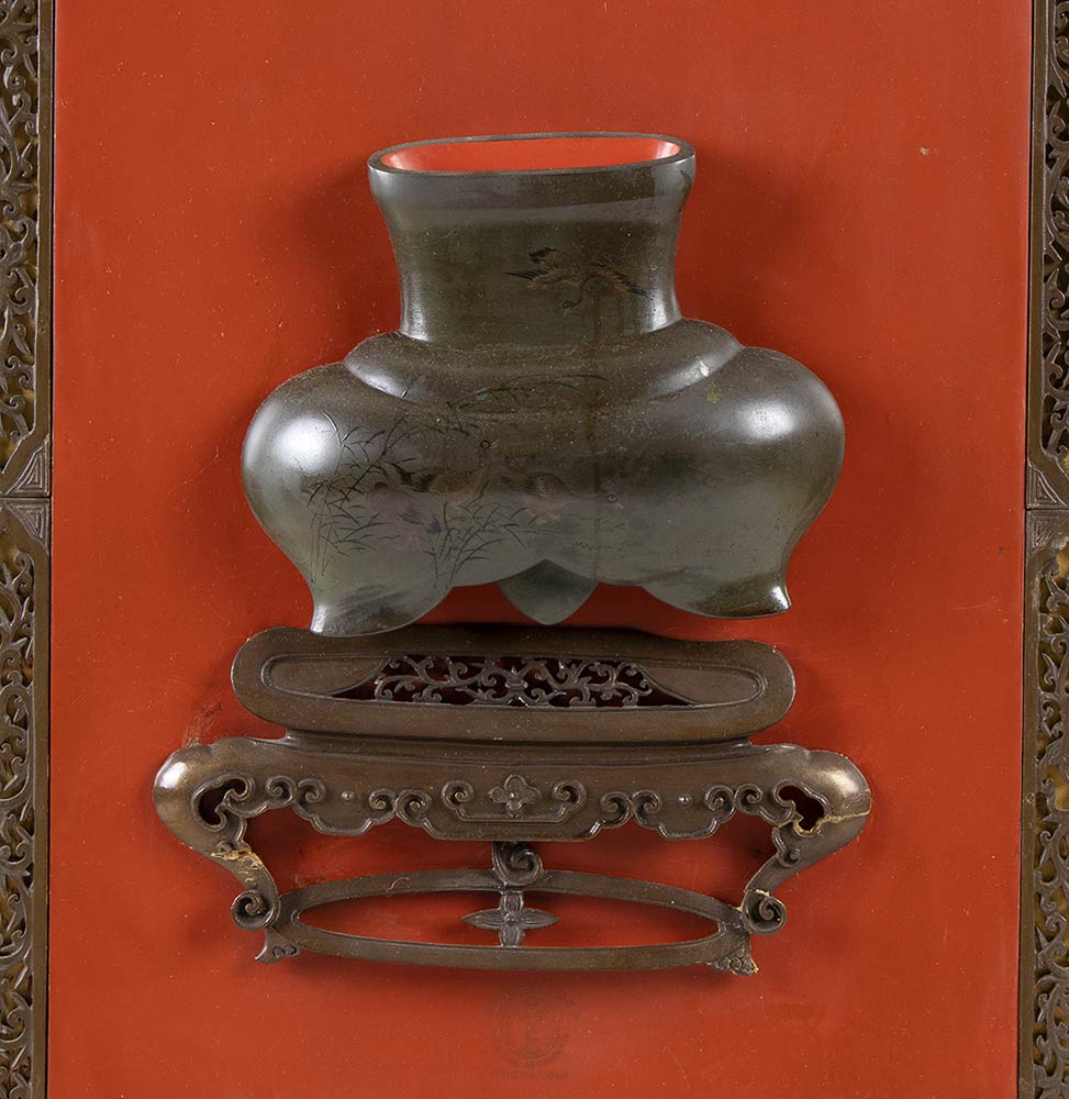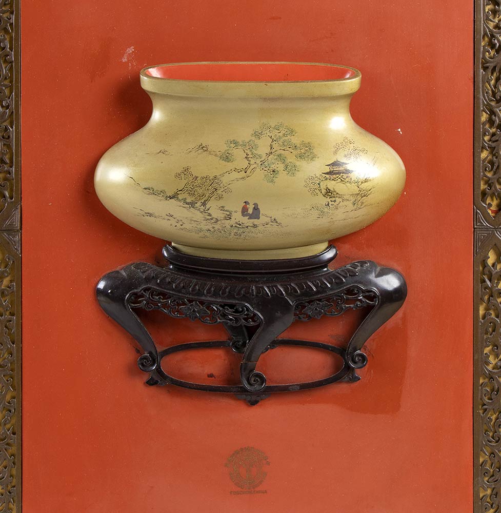 COPPIA DI PANNELLI IN LEGNO LACCATO E DORATO<br>Cina, XX secolo<br>