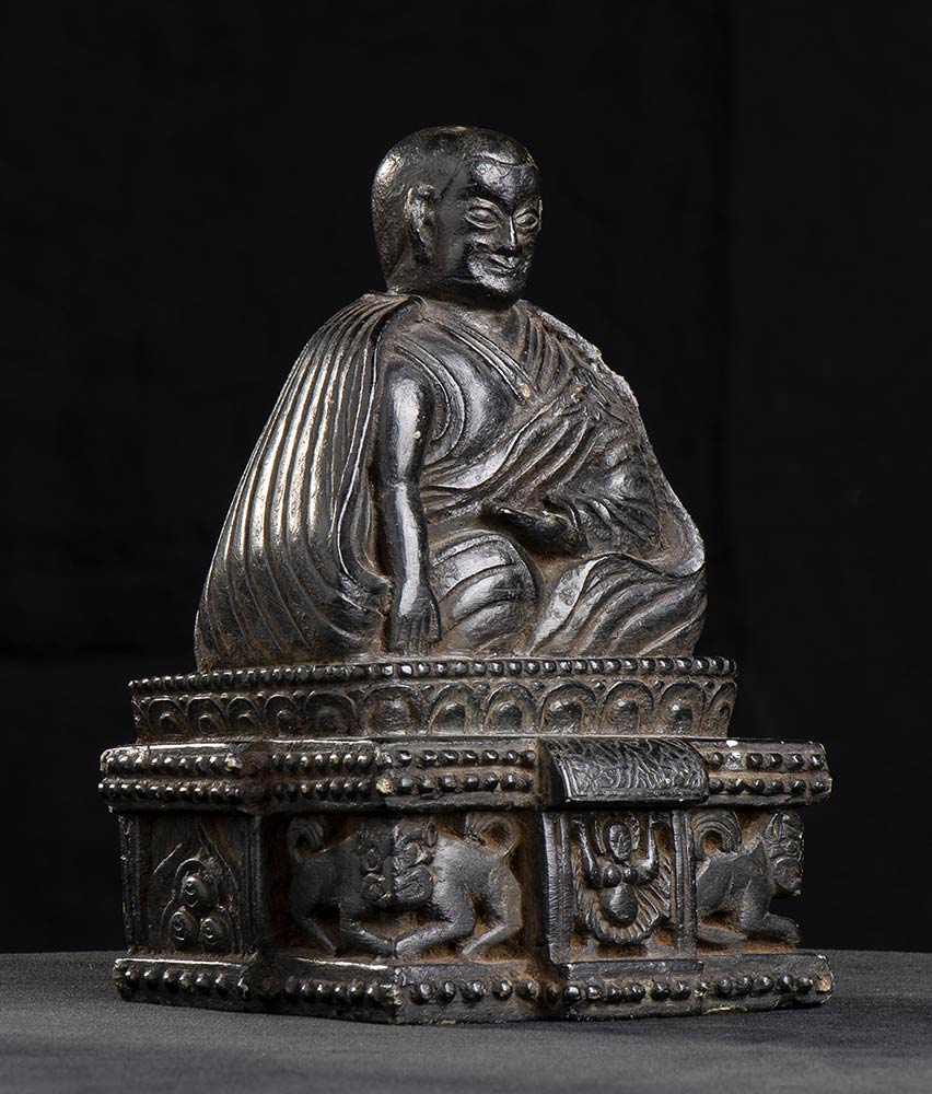 Il personaggio raffigurato potrebbe essere Phagmo Drupa Dorje Gyalpo (1110-1170), il primo monaco di una certa influenza nel monastero di Densatil, esponente della corrente Kagyu e famoso per l'importanza attribuita alla meditazione. Una scultura che lo ritrae, più antica ma iconograficamente vicina a questa, si trova nel Cleveland Museum of Art (D. Weldon – J. Casey Singer, The Sculptural Heritage of Tibet. Buddhist Art in the Nyingjei Collection, Londra 1999, p. 135, fig. 51).