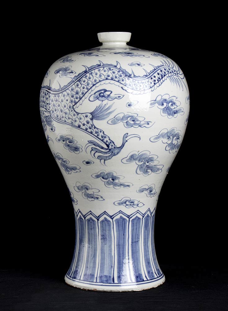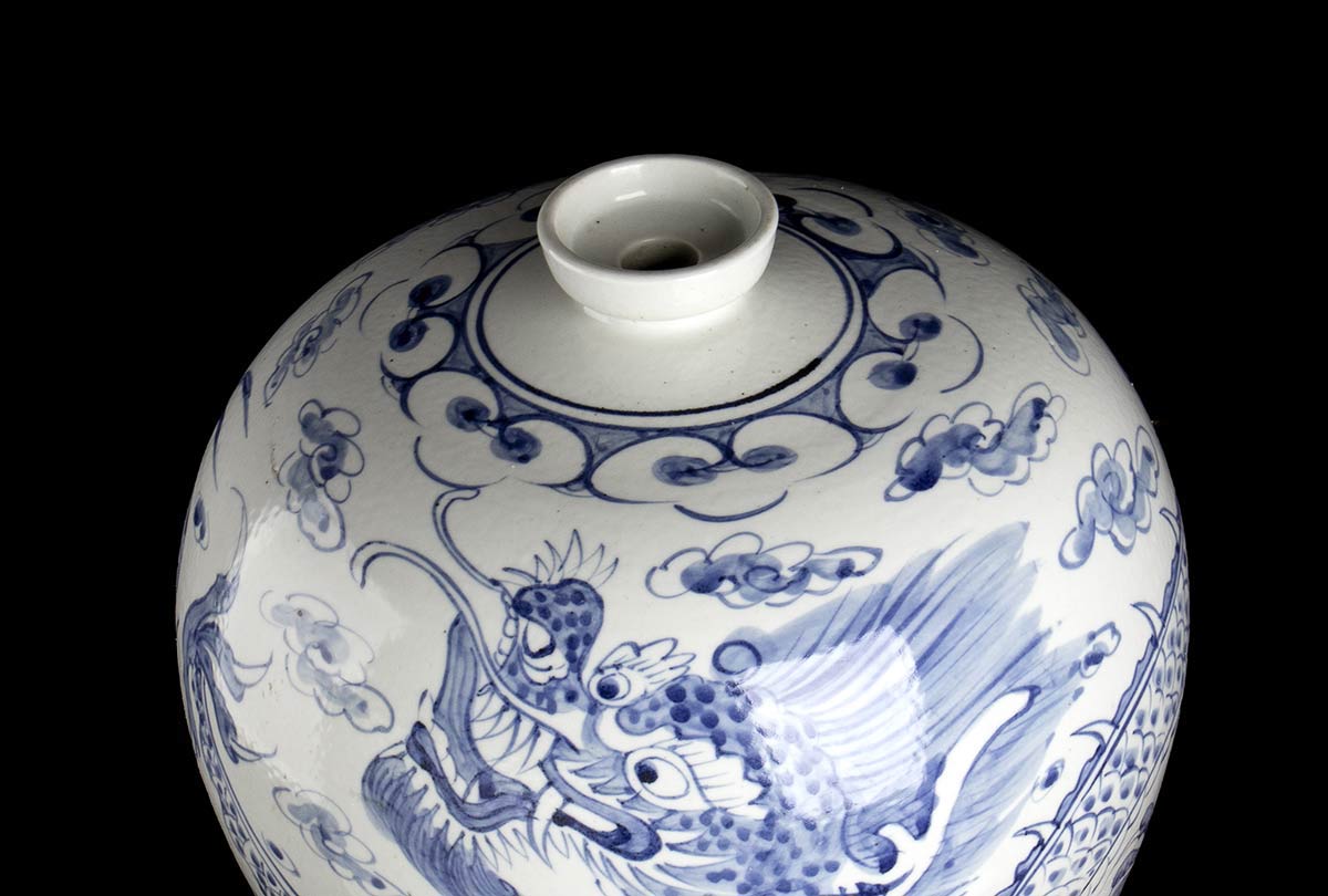 Vasi in porcellana coreana di grandi dimensioni, decorati in blu di cobalto con ornato di drago e nella forma maebyeong, come questo esemplare, sono piuttosto rari.