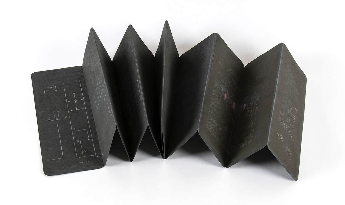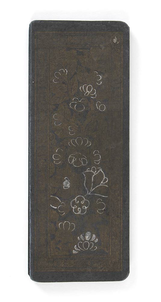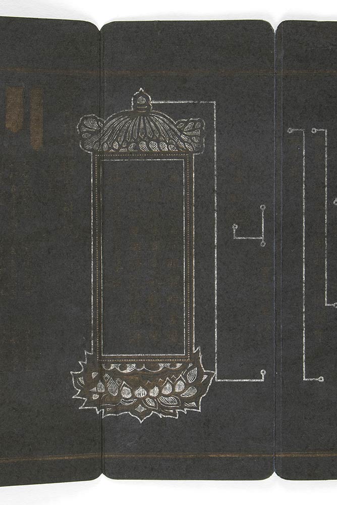 Il manoscritto pieghevole si compone di undici fogli (ognuno 24,7 x 9,3 cm) a fondo indaco sui quali si alternano brani di scrittura lumeggiati a oro all’interno di struttura lineare in argento, le pagine iniziale e finale con decoro floreale, un brano di scrittura inserito all’interno di cartiglio a lanterna, due pagine consecutive dedicate alla raffigurazione a oro, argento e policromia di una triade buddhista all’interno di un tempio.