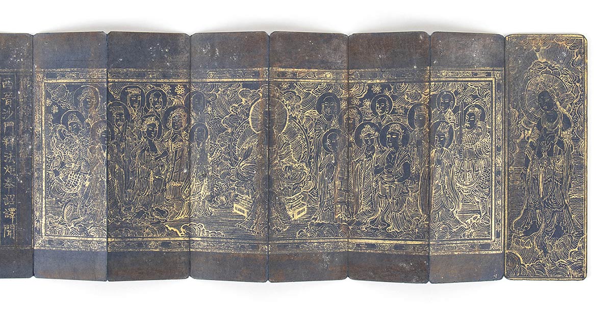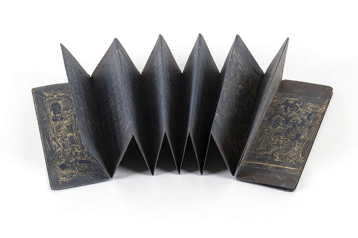 Il manoscritto pieghevole si compone di sedici fogli (ognuno 20.5 x 6.9 cm) a fondo indaco, sul quale si svolge testo immagini a oro. Un lato presenta ai due estremi due bodhisattva stanti; sulla sinistra, disposta su sei fogli, una scena continua con al centro il Buddha in trono fiancheggiato da divinità dell'ampio pantheon buddhista; segue il testo – sistemato in verticale con dodici caratteri per ogni fila - introdotto dal titolo del sutra. Sull'altro lato, ai due estremi il frontespizio e il foglio finale, ornati entrambi con arabesco floreale, il primo con cartiglio rettangolare con il titolo della scrittura in caratteri di stilo sigillo; a partire da destra, ancora il testo, al quale segue un'immagine disposta su tre fogli, raffigurante il Buddha seduto su una roccia, alla sua sinistra un gruppo di suoi fedeli discepoli.