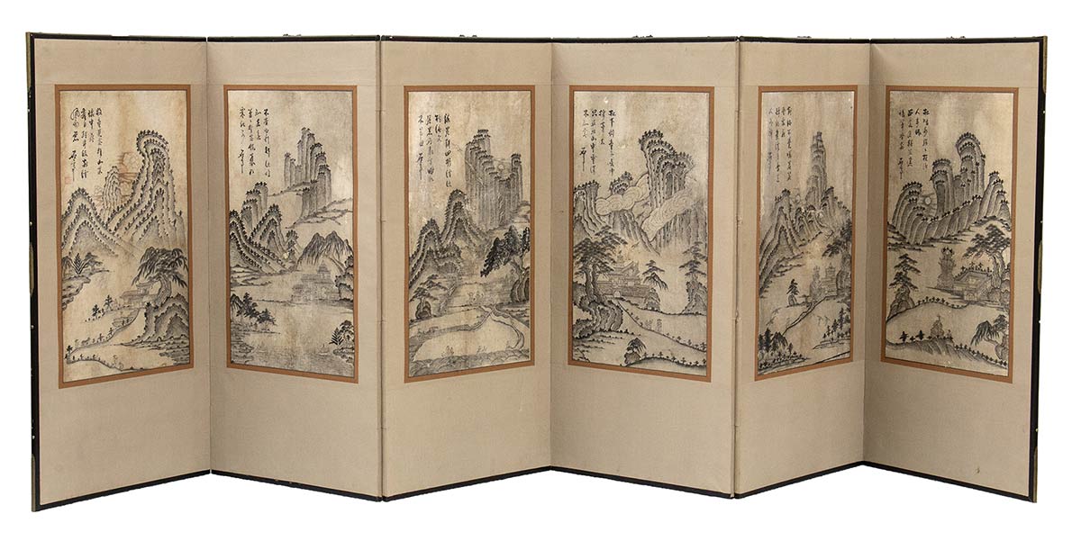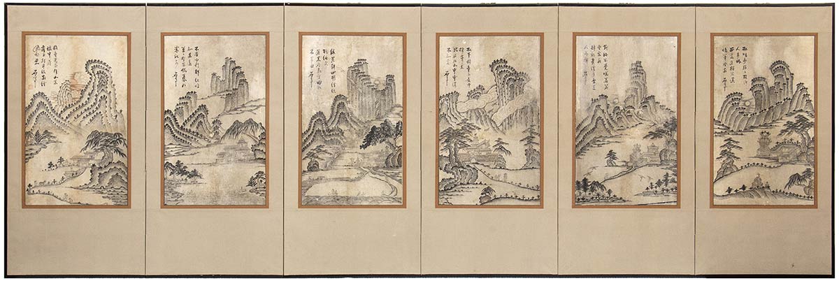 Paravento a sei ante su ognuna delle quali si dispone uno scorcio di paesaggio dipinto a inchiostro e colori tenui su carta, con alti pinnacoli rocciosi, alberi di pino,padiglioni templari e figure, ognuno dei pannelli con iscrizione in hanja e firma dell'artista seguita da sigillo.