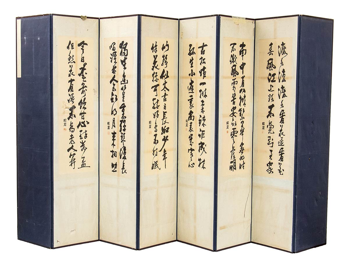 Il paravento si compone di otto composizioni autonome dipinte a inchiostro e colori su seta, ognuna delle quali presenta una decorazione con rami fioriti e uccelli di diverse specie, ogni pannello arricchito da un componimento poetico vergato a caratteri cinesi in bella calligrafia, tutti firmati 松岩 (Song-am).