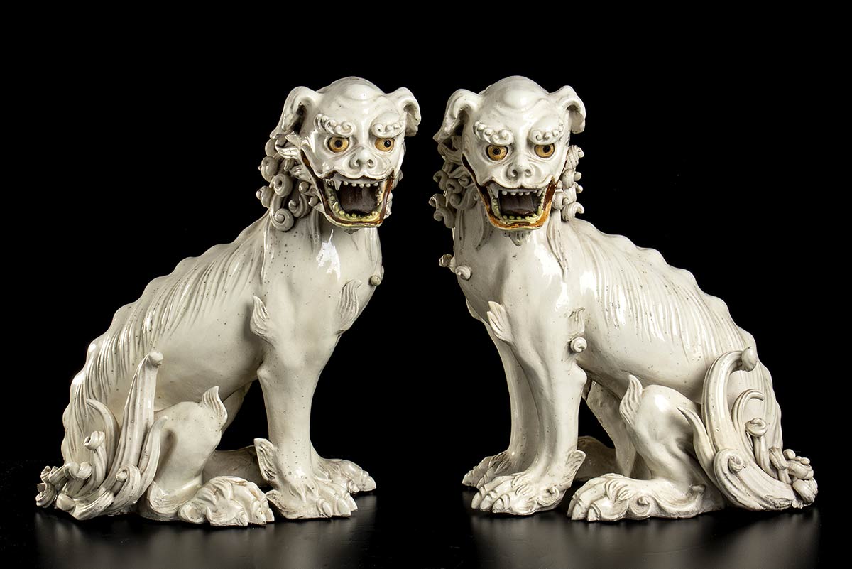 Entrambi seduti sulle zampe posteriori, con il capo accentuatamente piegato, la bocca aperta a mostrare l'aguzza dentatura, il profilo della bocca e gli occhi dipinti in giallo e rosso, l'esterno rivestito di invetriatura bianca.